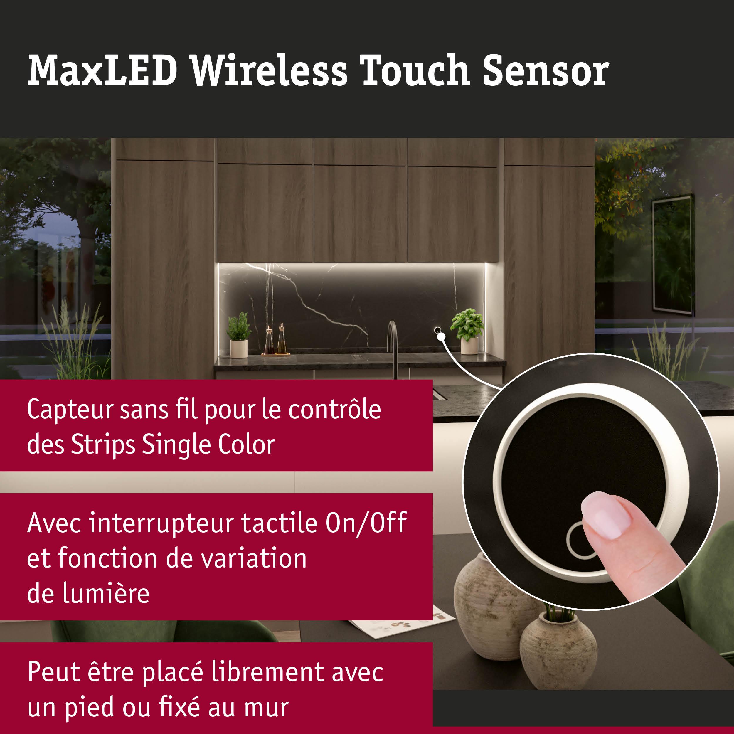 Les détecteurs tactiles sans fil de haute qualité pour la commande des Strips MaxLED combinent parfaitement qualité, design et fonctionnalité. Le design noir et blanc élégant et la construction sans fil permettent aux détecteurs sans fil de s'intégrer harmonieusement dans n'importe quel style de logement. Grâce au support mural adhésif, l'émetteur peut être fixé sans effort au mur et positionné dans le support magnétique selon les besoins. Le variateur intégré avec fonction tactile permet de créer l'ambiance lumineuse adéquate. Les détecteurs sans fil se distinguent également par leur appairage très facile grâce à un « Pairing Button » séparé. Grâce à une technologie performante, une charge à 100 % de la pile dure une année entière, tandis que la durée de vie est de 5 000 déclenchements.