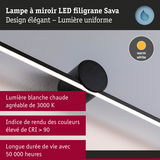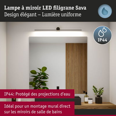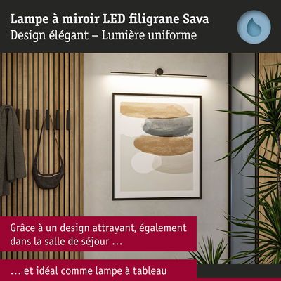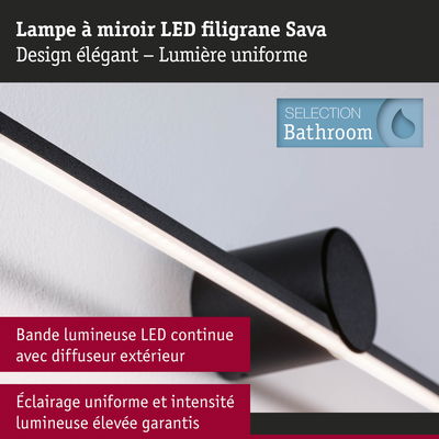 L’éclairage de miroir tubulaire Sava noir mat n'est pas seulement fonctionnel, son look moderne et filigrane en fait également un élément incontournable. Son indice de protection élevé IP44 le protège des projections d'eau, ce qui le rend particulièrement adapté aux salles de bains et autres pièces humides. Il se distingue non seulement par son élégance sobre, mais aussi par ses multiples possibilités d’utilisation : que ce soit dans la salle de bains, dans un couloir ou comme éclairage de tableau élégant, il s'intègre harmonieusement à tous les environnements. La bande lumineuse LED continue et satinée de 3 000K avec diffuseur extérieur garantit une diffusion de la lumière agréable et non éblouissante qui éclaire parfaitement la zone autour du miroir. Avec une largeur de 900x72mm, il s'utilise idéalement comme éclairage de miroir ou de tableau. Sa longue durée de vie, jusqu'à 50 000 h, et sa finition haut de gamme en métal et en acrylique font de ce luminaire un produit de qualité particulièrement élevée. Il est particulièrement intéressant à utiliser avec un miroir grâce à son excellent rendu des couleurs.