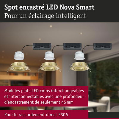 16 millions de couleurs, 16 millions d'ambiances lumineuses – Le set de spots encastrés intelligents Nova Coin en Doré mat avec fonction de changement de couleur confère à chaque pièce une ambiance lumineuse personnalisée. La livraison comprend trois ampoules LED interchangeables, y compris des bagues de montage en alu de haute qualité. Avec une puissance de 3x6 watts et le système de contrôle Zigbee 3.0 RGBW, ils fournissent une solution d'éclairage efficace et innovante. ZigBee 3.0 est un protocole de transmission radio qui met en réseau les appareils de différents fabricants. Ainsi, les luminaires peuvent être pilotés individuellement ou collectivement via une application, une télécommande ou une commande vocale : Qu'il s'agisse d'une lumière dorée chaude et confortable (2200 K), d'un blanc lumière du jour sobre et lumineux (6500 K) ou de dégradés de couleurs multicolores, la combinaison de Tunable White, RGB et de la fonction de variation d’intensité offre d'innombrables possibilités. Les spots encastrés intelligents peuvent être allumés et éteints facilement et confortablement à l'aide d'un interrupteur conventionnel. La fonction mémoire intégrée se souvient toujours du dernier réglage d’éclairage utilisé – pour un confort maximal. Grâce à la capacité de pivotement des luminaires, la lumière se diffuse précisément là où vous le souhaitez. Le montage est particulièrement simple et efficace grâce aux Coins chaînables et interchangeables, à la faible profondeur d'encastrement (seulement 45 mm) et au raccordement direct en 230 V.
