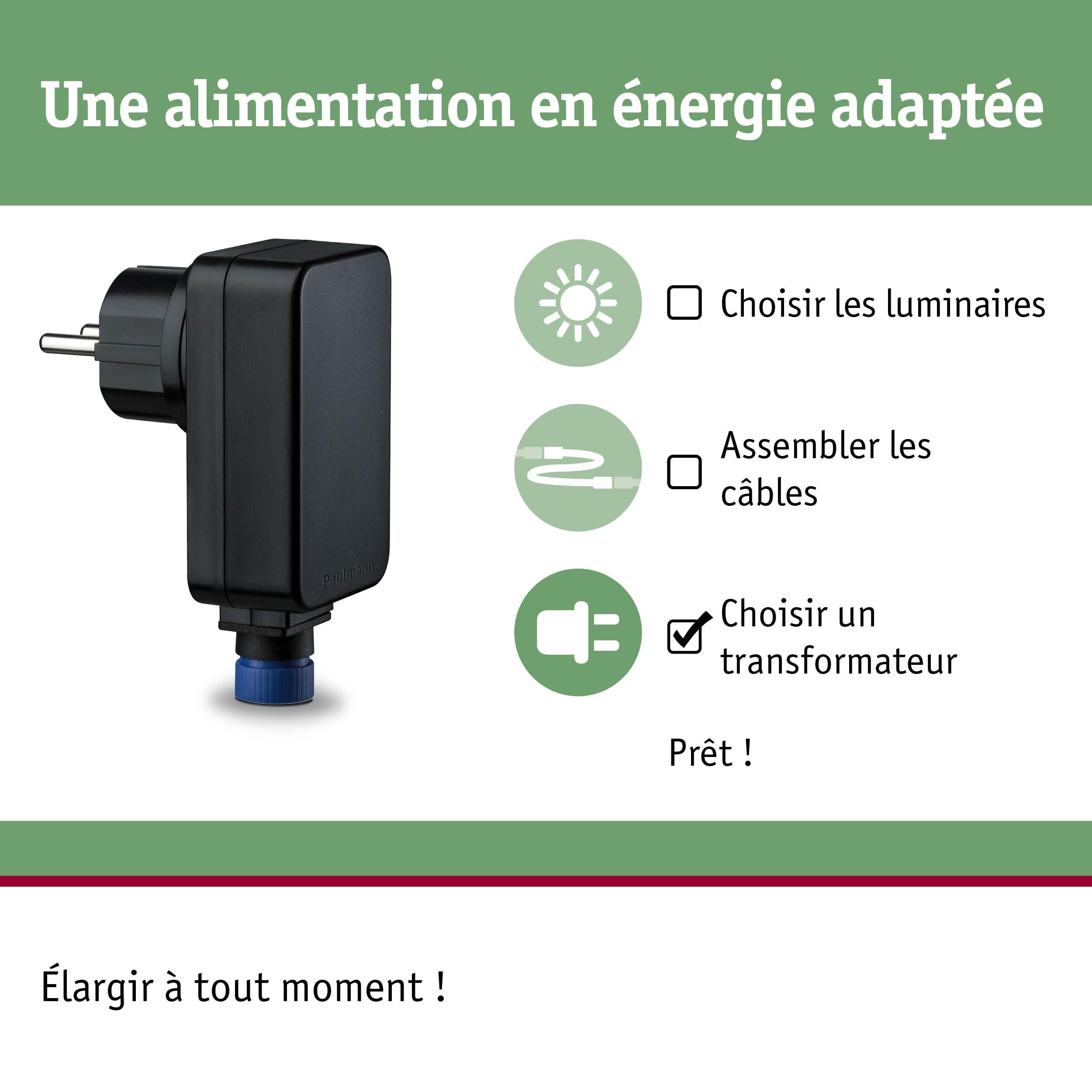 Le transfo Plug & Shine de 21 watts constitue la base de votre installation lumineuse d'extérieur, autour de la maison, sur la terrasse et dans le jardin. Combinez à votre guise différents luminaires et connecteurs de la série Plug & Shine jusqu'à une longueur de système maximale de 50 mètres.