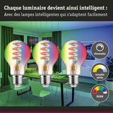 Les ampoules LED avec RGBW+ et une puissance de 3 x 6,3 watts et 3 x 470lm créent une lumière agréablement uniforme. Les ampoules sont compatibles avec les douilles E27 conventionnelles. L'ampoule est compatible Zigbee 3.0 3.0. ZigBee est un protocole de transmission radio qui met en réseau les appareils de différents fabricants. Selon l'ambiance désirée, vous pouvez choisir entre un blanc chaud véritable, une lumière colorée et d'autres effets différents. Les poirettes sont les plus petites des ampoules à filetage et de véritables tout-terrain. Peu importe qu'elles soient utilisées dans des guirlandes, des vitrines voire même dans le réfrigérateur, leur petite taille leur permet d'être polyvalentes. Les lampes LED Paulmann portant le label Eye friendly produisent une lumière confortable qui préserve les yeux. Que ce soit pour travailler, lire ou se détendre, les lampes contribuent à un meilleur confort visuel.