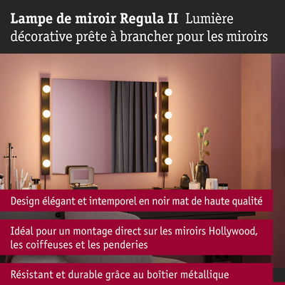 Le Regula II à 4 flammes est le choix idéal pour un éclairage de miroir décoratif. Elle est livrée avec un connecteur de câble textile pratique de couleur Noir, rendant son installation très facile. Une seule prise de courant est nécessaire, il n'est pas nécessaire de prévoir une sortie de courant au mur. Avec son design moderne et épuré en Noir, elle s'intègre harmonieusement dans différents styles d'intérieur et attire l'attention visuellement aussi bien sur la coiffeuse que dans le couloir. La longueur de 60 cm est adaptée aux dimensions standard des miroirs. Elle est également disponible avec différentes ampoules avec douille E14, ce qui permet de la personnaliser en fonction de l'application. Pour un look glamour de miroir de maquillage façon Hollywood, les éclairage de miroir sont particulièrement adaptées. Elles assurent un éclairage non éblouissant et créent des réflexions lumineuses très esthétiques. Pour un look moderne et classique, il suffit d'utiliser des ampoules opales qui diffusent une lumière omnidirectionnelle. L'installation du Regula II est très simple : elle peut être montée sur le mur au-dessus ou à côté du miroir. Il suffit de visser les ampoules souhaitées pour qu'elle soit immédiatement opérationnelle. Pour nettoyer les luminaires, il est préférable d'utiliser un chiffon doux – évitez d'utiliser un chiffon en microfibre.