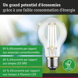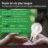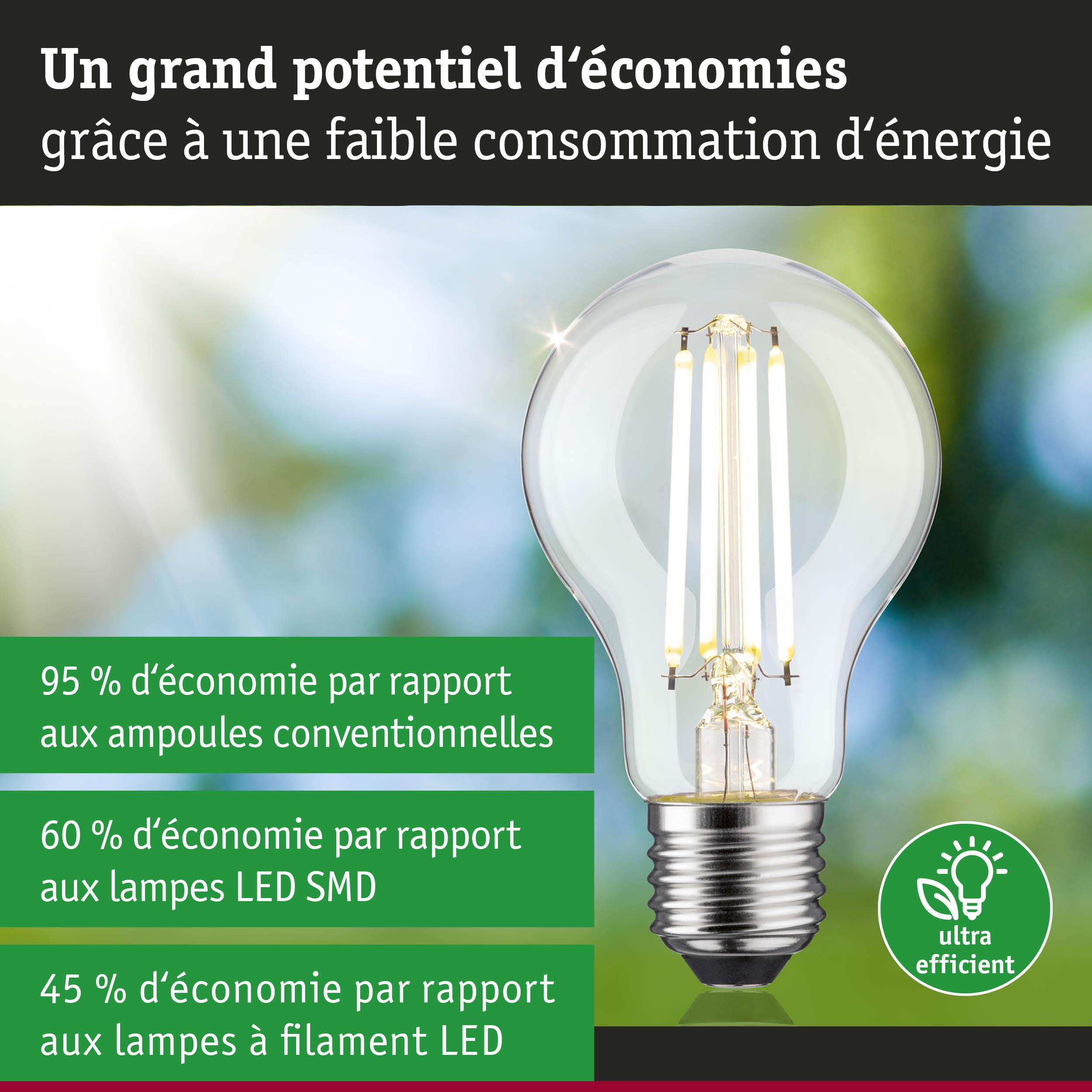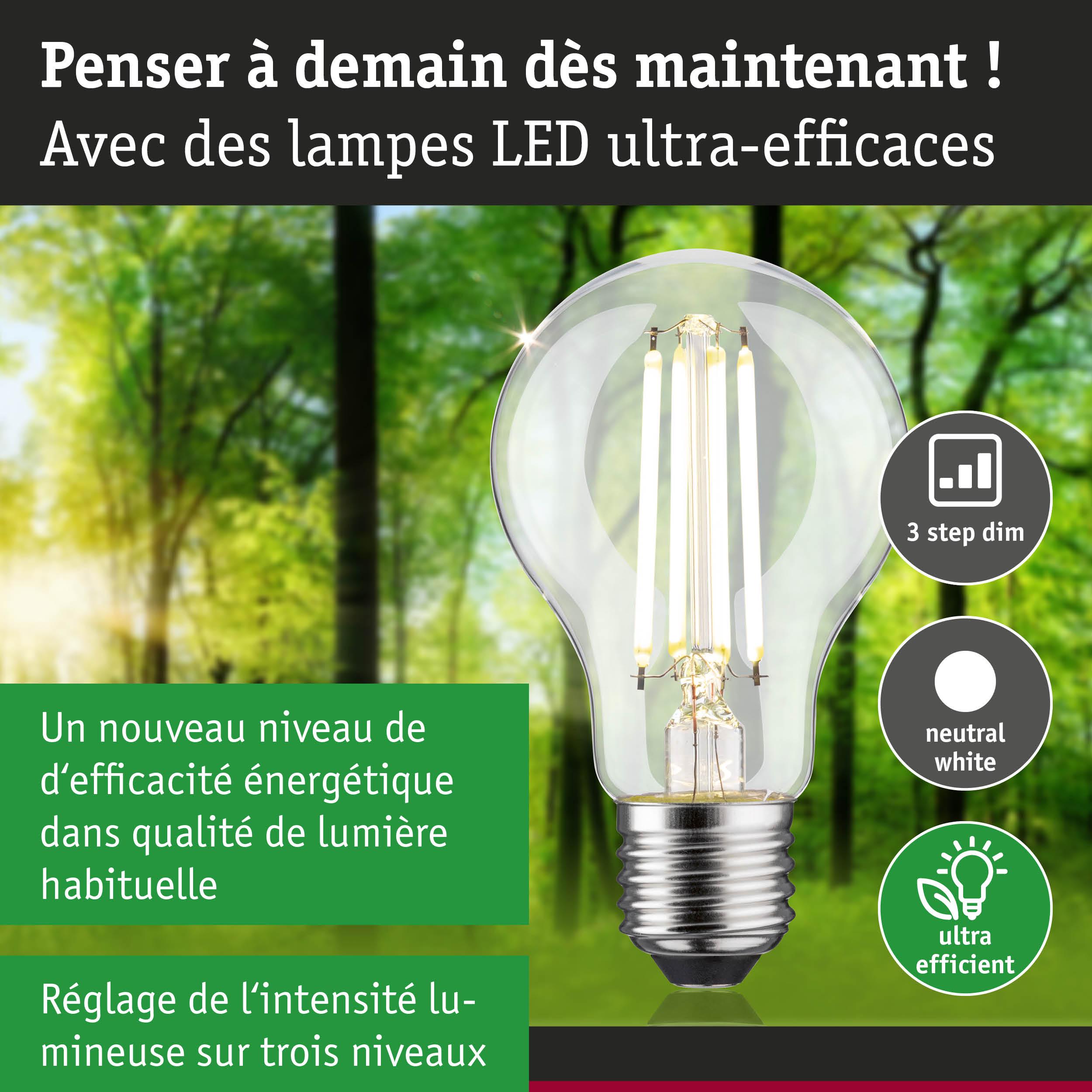 Les ampoules LED ultra efficaces de la gamme LED Eco-Line allient technologie innovante et durabilité pour un éclairage efficace et stylé. La consommation d'énergie réduite de 60% et la durée de vie nettement plus longue que les ampoules LED standard permettent de réduire considérablement les coûts énergétiques tout en préservant l'environnement. L'ampoule LED à filament claire s'adapte à toutes les douilles E27 courantes et produit, avec 4000K, une puissance de 4,3W, une lumière blanc neutre agréable sans teinte verte. Même les grands abat-jour sont éclairés de manière uniforme, ce qui apporte à chaque pièce une ambiance de bien-être harmonieuse. Selon les besoins, l'intensité lumineuse de l'ampoule peut être graduée sur 3 niveaux à l'aide d'un interrupteur conventionnel. Le variateur dispose d'une fonction mémoire. Les ampoules LED Paulmann portant le label Eye friendly produisent une lumière confortable qui préserve les yeux. Que ce soit pour travailler, lire ou se détendre, les ampoules contribuent à un meilleur confort visuel.