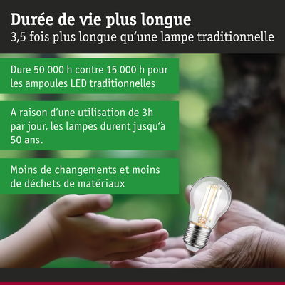 Les ampoules LED ultra efficaces de la gamme Eco-Line allient technologie innovante et durabilité pour un éclairage efficace et stylé. Grâce à une consommation d'énergie réduite de 60 % et à une durée de vie résolument plus longue que celle des ampoules LED standard, il est possible de réduire considérablement les coûts énergétiques tout en préservant l'environnement. L'ampoule sphérique à filament claire s'adapte à toutes les douilles E27 courantes et produit, avec 3000K, une puissance de 2,5 W et 525 lm, une lumière blanc chaud agréable sans teinte verte. Ainsi, l'ampoule en forme de sphère apporte à chaque pièce une ambiance de bien-être harmonieuse. Grâce à leur forme compacte, les ampoules sphériques sont idéales pour les petits luminaires. Les ampoules LED Paulmann portant le label Eye friendly produisent une lumière confortable qui préserve les yeux. Que ce soit pour travailler, lire ou se détendre, les ampoules contribuent à un meilleur confort visuel.