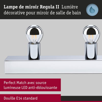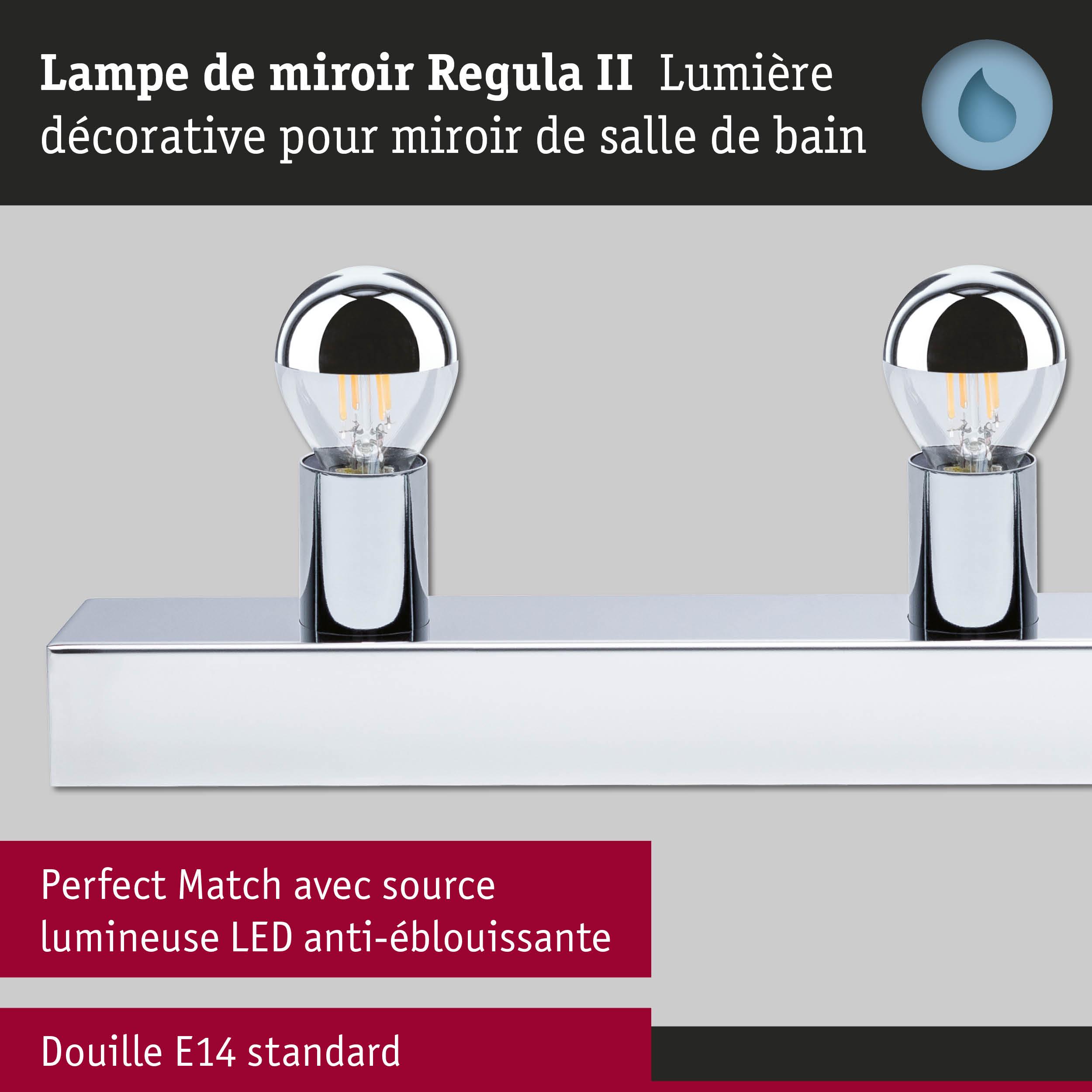 Resplendissant – La solution d'éclairage idéale pour la salle de bains. Ce kit pratique contient la réglette lumineuse Regula II en Chrome, Calotte argentée, ainsi que les ampoules à calotte réflectrice adaptées. Grâce à son indice de protection IP44 particulièrement élevé, la réglette lumineuse Regula II à 3 flammes est protégée contre les projections d’eau et convient donc parfaitement à une utilisation dans la salle de bains ou dans d’autres pièces humides. Avec son design moderne et épuré, elle s’intègre facilement dans n’importe quel style d’intérieur. La longueur de 45 cm est adaptée aux dimensions standard des miroirs et convient également parfaitement aux miroirs plus petits que l'on trouve souvent dans les WC invités. Sont incluses dans la livraison 3 ampoules à calotte réflectrice sphériques en Chrome, Calotte argentée, qui vous donneront un look glamour digne des miroirs de maquillage hollywoodiens ! Avec une puissance de 3x4,8W, elles diffusent une lumière blanc chaud dans toutes les directions. Vous pouvez régler la luminosité en fonction de vos besoins. L'installation du Regula II est très simple : elle peut être montée sur le mur au-dessus ou à côté du miroir. Il suffit de visser les ampoules à calotte réflectrice sphériques ou d’autres ampoules de votre choix munies d’une douille E14, pour qu’elle soit immédiatement opérationnelle. Plus rien ne s'oppose donc à une ambiance lumineuse agréable dans la salle de bains. Pour nettoyer les luminaires, il est préférable d'utiliser un chiffon doux – évitez d'utiliser un chiffon en microfibre. Selon l'ampoule utilisée, la lampe est dimmable.