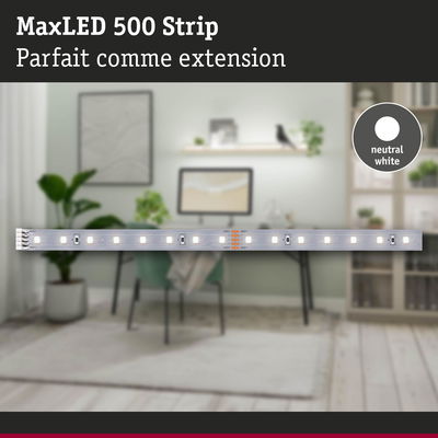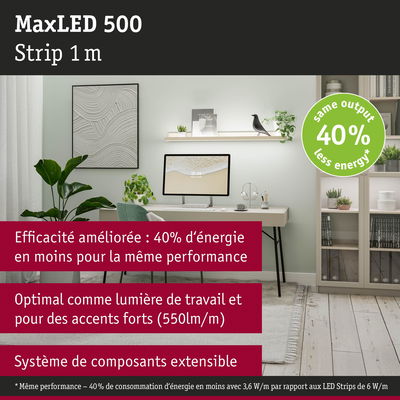 Le Strip LED MaxLED 500 blanc neutre est le choix idéal pour une solution d’éclairage moderne et particulièrement efficace en termes d’énergie. Par rapport aux luminaires traditionnels, le Strip LED consomme 40 % d’énergie en moins pour le même rendement lumineux. Le Strip convient parfaitement à l’utilisation dans les profilés et, avec une température de couleur de 4000 K, il fournit une lumière propice au travail blanc neutre et non éblouissante. À tout moment, vous pouvez créer l’ambiance lumineuse souhaitée en atténuant la luminosité de manière flexible. Le Strip est facile à raccourcir à l’aide de ciseaux et il s’adapte ainsi facilement aux conditions propres à votre pièce. Comme le Strip est facile à fixer aux meubles, aux étagères ou aux murs, de nombreuses options de décoration s’offrent à vous.