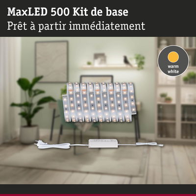 Le kit de base MaxLED 500 blanc chaud est le choix idéal pour une solution d’éclairage moderne et particulièrement efficace en termes d’énergie. Par rapport aux luminaires traditionnels, le Strip LED consomme 40 % d’énergie en moins pour le même rendement lumineux. Le Strip convient parfaitement à l’utilisation dans les profilés et, avec une température de couleur de 2700 K, il fournit une lumière propice au travail agréable et non éblouissante. À tout moment, vous pouvez créer l’ambiance lumineuse souhaitée en atténuant la luminosité de manière flexible. Le Strip est facile à raccourcir à l’aide de ciseaux et il s’adapte ainsi facilement aux conditions propres à votre pièce. Comme le Strip est facile à fixer aux meubles, aux étagères ou aux murs, de nombreuses options de décoration s’offrent à vous. En plus du ruban, le kit de base comprend un ballast électronique adapté. Il est possible, au besoin, d'étendre le système à l'aide d'une unité de commande avec télécommande.