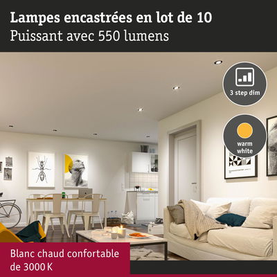 Design épuré en pack de 10 : les spots encastrables à LED orientables individuellement en blanc intemporel font toute la lumière exactement là où elle est nécessaire. La fonction 3-Step-Dim intégrée vous permet de naviguer entre trois intensités de lumière en actionnant plusieurs fois un simple commutateur traditionnel.