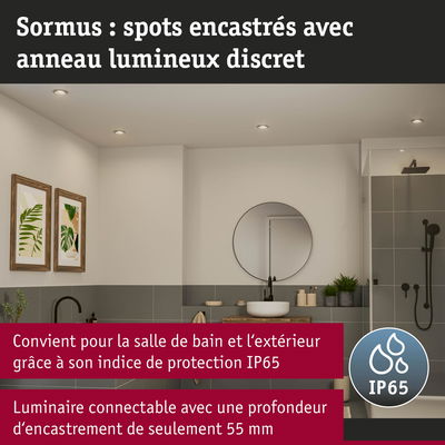 Le kit de spots encastrés Sormus en Chrome mat est la solution idéale pour créer une ambiance lumineuse dans la salle de bains, où la fonctionnalité s’allie au design moderne. Avec la protection IP65, le luminaire est préservé de la pénétration des jets d’eau et convient donc parfaitement pour les locaux humides ou l’extérieur. La diffusion lumineuse extra-large assure un éclairage lumineux qui, avec une température de couleur de 3000 K, plonge la pièce dans une couleur de feu blanc chaud. L’un des points forts du spot encastré Sormus est sa commande d’éclairage flexible, qui permet de choisir entre un éclairage lumineux de la salle de bains et des accents lumineux décoratifs. En appuyant plusieurs fois sur un interrupteur conventionnel, vous pouvez choisir entre un éclairage principale, un anneau décoratif éclairé ou une combinaison des deux. Le spot encastré Sormus présente une profondeur d’encastrement d’à peine 55 mm, ce qui permet de l’installer dans des faux plafonds peu profonds. Le boîtier de raccordement pratique permet un raccordement direct en 230 V et permet de raccorder les luminaires entre eux très facilement et sans restriction.