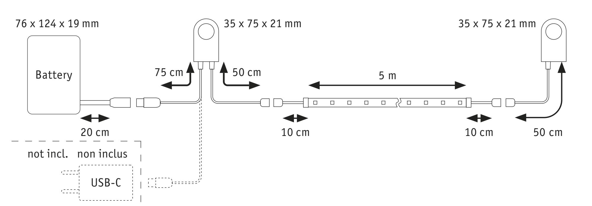 Le kit de batterie MaxLED Stairs constitue la base d'un éclairage élégant et sûr dans les escaliers ou les lieux de passage, sans aucun raccordement électrique. Le Stripe peut être placé sous l'escalier ou sur le limon de l'escalier. Contrairement aux solutions encastrées, ce système peut aussi être monté facilement ultérieurement : Enficher, coller, terminé ! Il peut fonctionner avec des piles 8xAA ou en permanence grâce à la connexion USB-C (5V). En plus du rubans LED Stripe de 5 m de long en blanc chaud (3000 K), 2 détecteurs de mouvement crépusculaires câblés sont inclus dans la livraison. Ceux-ci allument automatiquement la lumière afin d'éviter de trébucher dans l'obscurité. La Durée d'éclairage ainsi que l'utilisation et le moment de déclenchement du capteur crépusculaire et du détecteur de mouvement sont réglables individuellement.