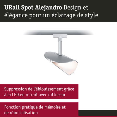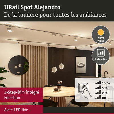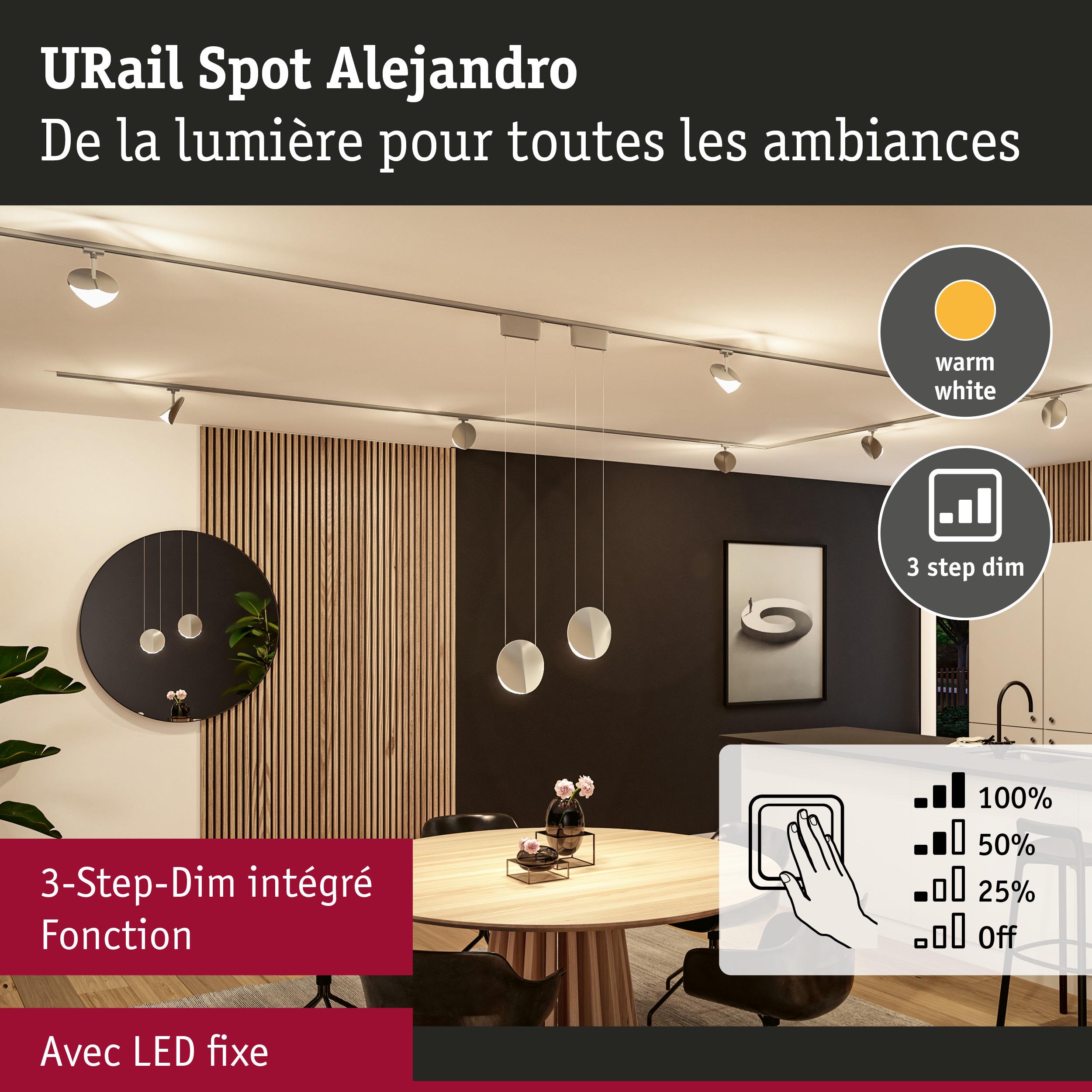 Le Spot URail Alejandro en Chrome mat attire tous les regards, au mur ou au plafond, et met la pièce en valeur grâce à son design élégant. La fonction 3-Step-Dim permet de contrôler facilement l'éclairage grâce au commutateur mural fourni, sans variateur mural supplémentaire. Avec ses niveaux de gradation de 100 %, 50 % et 25 %, le spot propose une commande d'éclairage flexible, adaptée à toutes les ambiances et situations. Les 3 000 Kelvin donnent lieu à une lumière blanc chaud agréable, qui éclaire parfaitement la pièce. Grâce à la puce LED encastrée à diffuseur, la lumière se diffuse de façon uniforme et n'éblouit pas, ce qui contribue à créer une atmosphère agréable. Les fonctions de sauvegarde et de réinitialisation sont particulièrement pratiques. Elles permettent de conserver la dernière luminosité paramétrée ou, au besoin, de réinitialiser la luminosité. Le design du spot confère à toutes les pièces une élégance sûre et des touches décoratives.