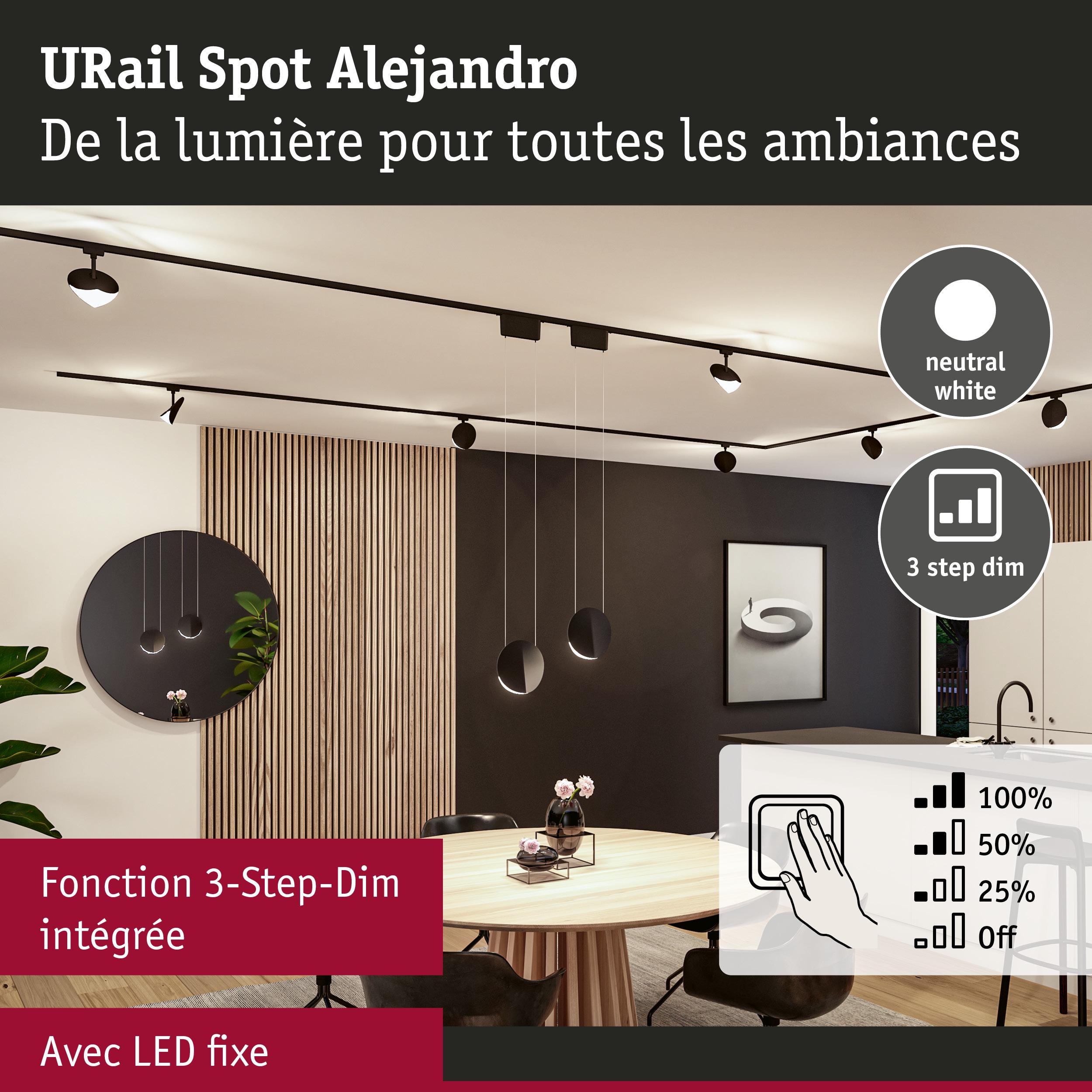 Le Spot URail Alejandro en Noir mat attire tous les regards, au mur ou au plafond, et met la pièce en valeur grâce à son design élégant. La fonction 3-Step-Dim permet de contrôler facilement l'éclairage grâce au commutateur mural fourni, sans variateur mural supplémentaire. Avec ses niveaux de gradation de 100 %, 50 % et 25 %, le spot propose une commande d'éclairage flexible, adaptée à toutes les ambiances et situations. Les 4 000 Kelvin donnent lieu à une lumière blanc neutre agréable, qui éclaire parfaitement la pièce. Grâce à la puce LED encastrée à diffuseur, la lumière se diffuse de façon uniforme et n'éblouit pas, ce qui contribue à créer une atmosphère agréable. Les fonctions de sauvegarde et de réinitialisation sont particulièrement pratiques. Elles permettent de conserver la dernière luminosité paramétrée ou, au besoin, de réinitialiser la luminosité. Le design du spot confère à toutes les pièces une élégance sûre et des touches décoratives.