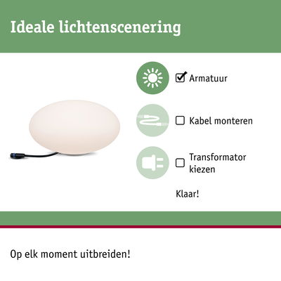 Het lichtobject Plug & Shine Stone met een diameter van 35 centimeter is een decoratieve blikvanger in bloemperken, op het terras of het balkon. Met trafo’s, verbindingen en andere armaturen uit de Plug & Shine-serie stelt u uw individuele lichtinstallatie voor buiten samen.
