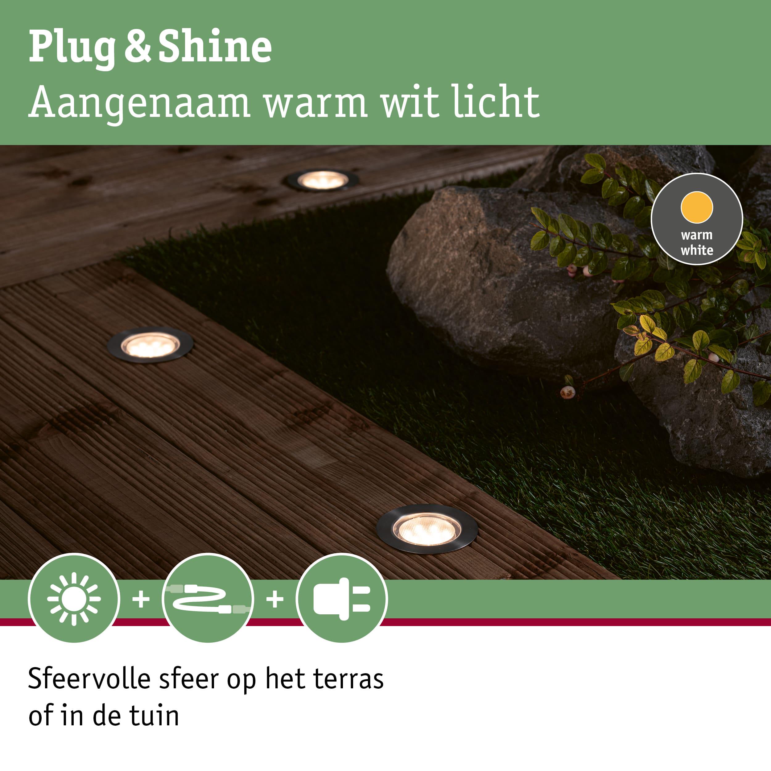- Plug & Shine basisset bestaande uit 3 armaturen, 5 meter verbindingskabel en trafo