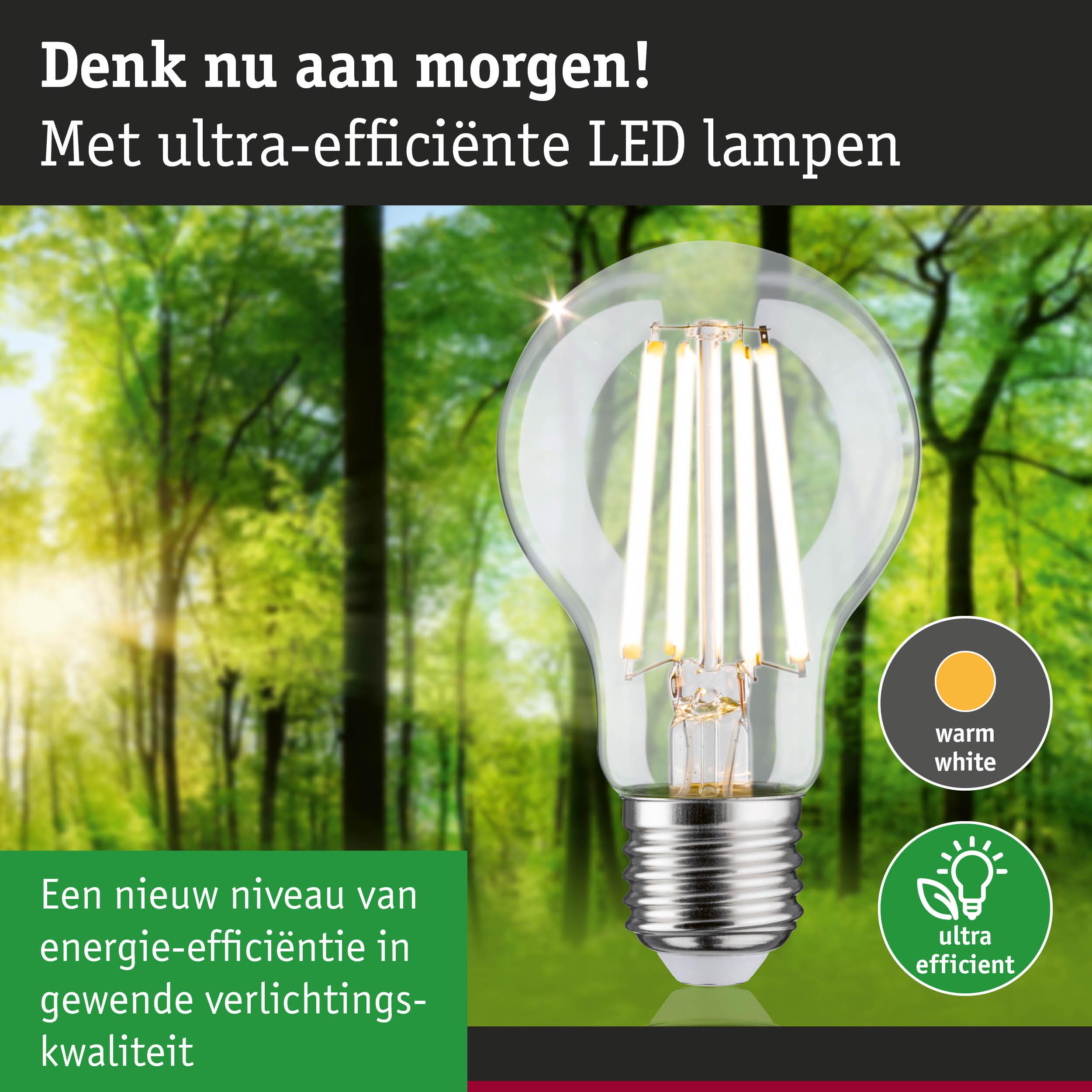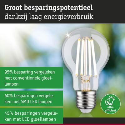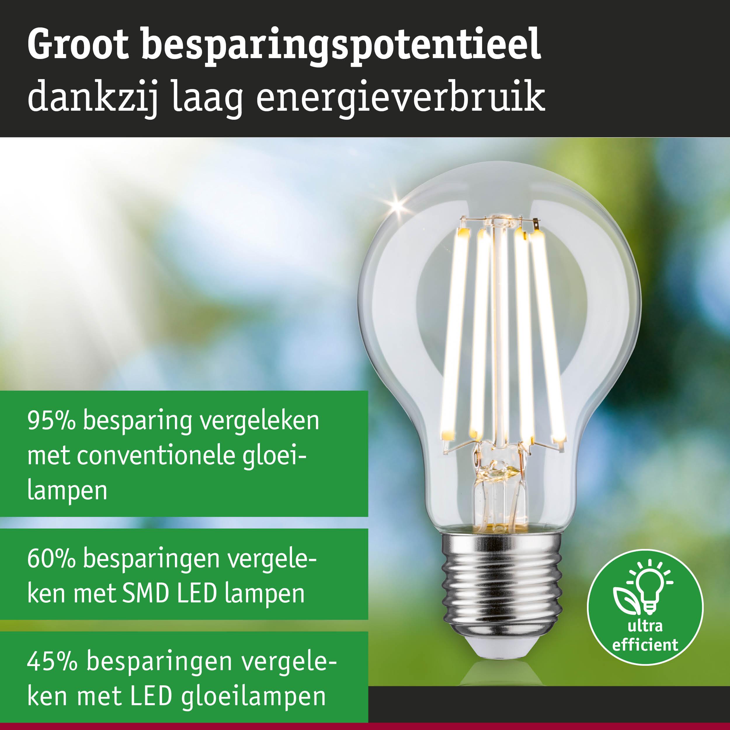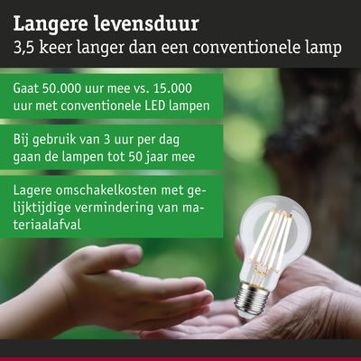 De uiterst efficiënte verlichtingsmiddelen van Eco-Line combineren innovatie met duurzaamheid. Door het 60% lagere energieverbruik en de aanzienlijk langere levensduur ten opzichte van standaard LED-lampen zijn de energiekosten aanzienlijk lager en daarnaast is het ook nog goed voor het milieu. De filament LED peer met 3000K, een vermogen van 4,5W en 840lm creëert een aangenaam gelijkmatig licht zonder groene gloed. De lamp past in elke gangbare E27 fitting. Zelfs grote lampenkappen worden gelijkmatig verlicht. Het verlichtingsmiddel is traploos dimbaar. De Paulmann LED-lampen met Eye Friendly label bieden oogvriendelijk en comfortabel licht. Bij het werken, lezen of ontspannen zorgen de lampen voor het beste zichtcomfort.