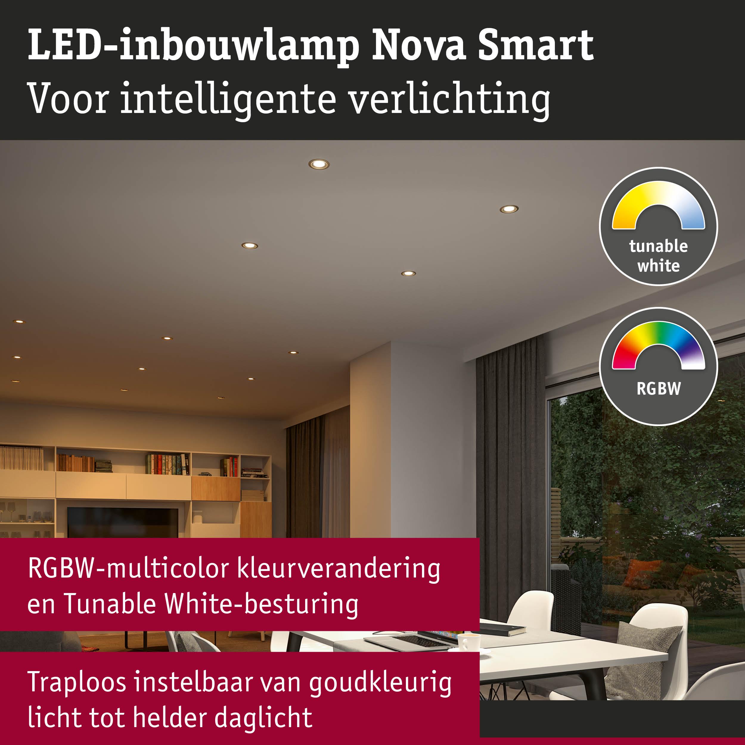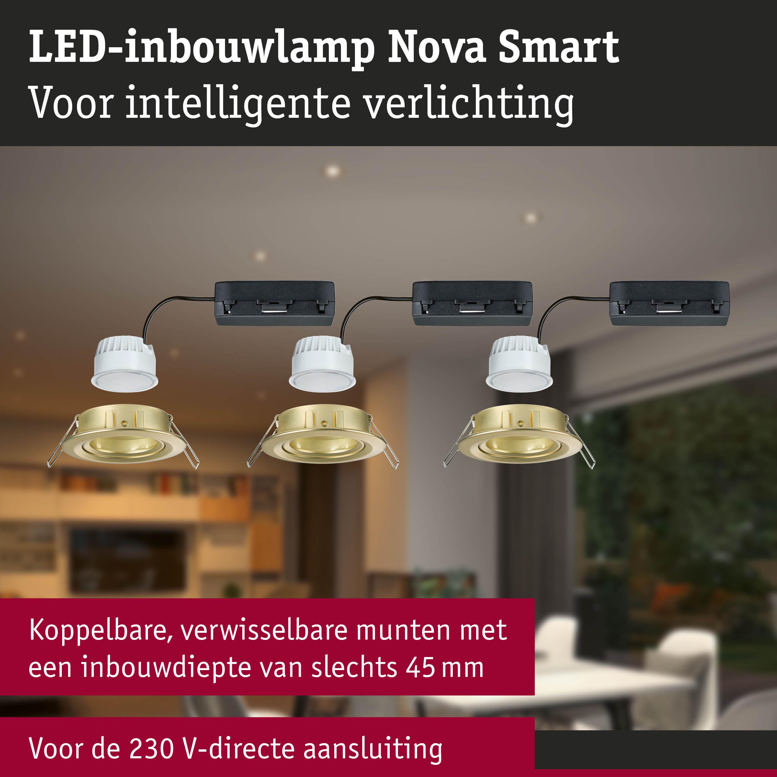 16 miljoen kleuren, 16 miljoen lichtsferen – de smart inbouwlampen set Nova Coin in Goud mat met kleurveranderingsfunctie schept in elke ruimte een individuele woonsfeer. In de leveringsomvang zijn drie vervangbare LED-verlichtingsmiddelen inclusief hoogwaardige aluminium inbouwringen inbegrepen. Met een vermogen van 3x6 watt en RGBW-Zigbee 3.0-besturing zorgen ze voor een efficiënte en innovatieve verlichtingsoplossing. Zigbee 3.0 is een draadloos overdrachtsprotocol dat apparaten van verschillende fabrikanten met elkaar verbindt. Zo kunnen de armaturen via de app, afstandsbediening of spraak afzonderlijk of gezamenlijk worden bestuurd: gezellig warm goudlicht (2200 K), zakelijk helder daglicht wit (6500 K) of een stralend kleurverloop - de combinatie van Tunable White, RGB en dimfunctie biedt talloze mogelijkheden. De smart inbouwlampen kunnen nog steeds eenvoudig en gemakkelijk via een gangbare lichtschakelaar worden in- en uitgeschakeld. Daarnaast zorgt het geïntegreerde memory-effect ervoor dat altijd de laatst gebruikte lichtinstelling wordt onthouden voor een maximaal comfort. Dankzij de zwenkbaarheid van de armaturen kan het licht op elke gewenste plek worden gericht. De set wordt erg gemakkelijk en efficiënt gemonteerd dankzij de koppelbare en vervangbare coins, de geringe inbouwdiepte van slechts 45 mm en de 230V-aansluiting.