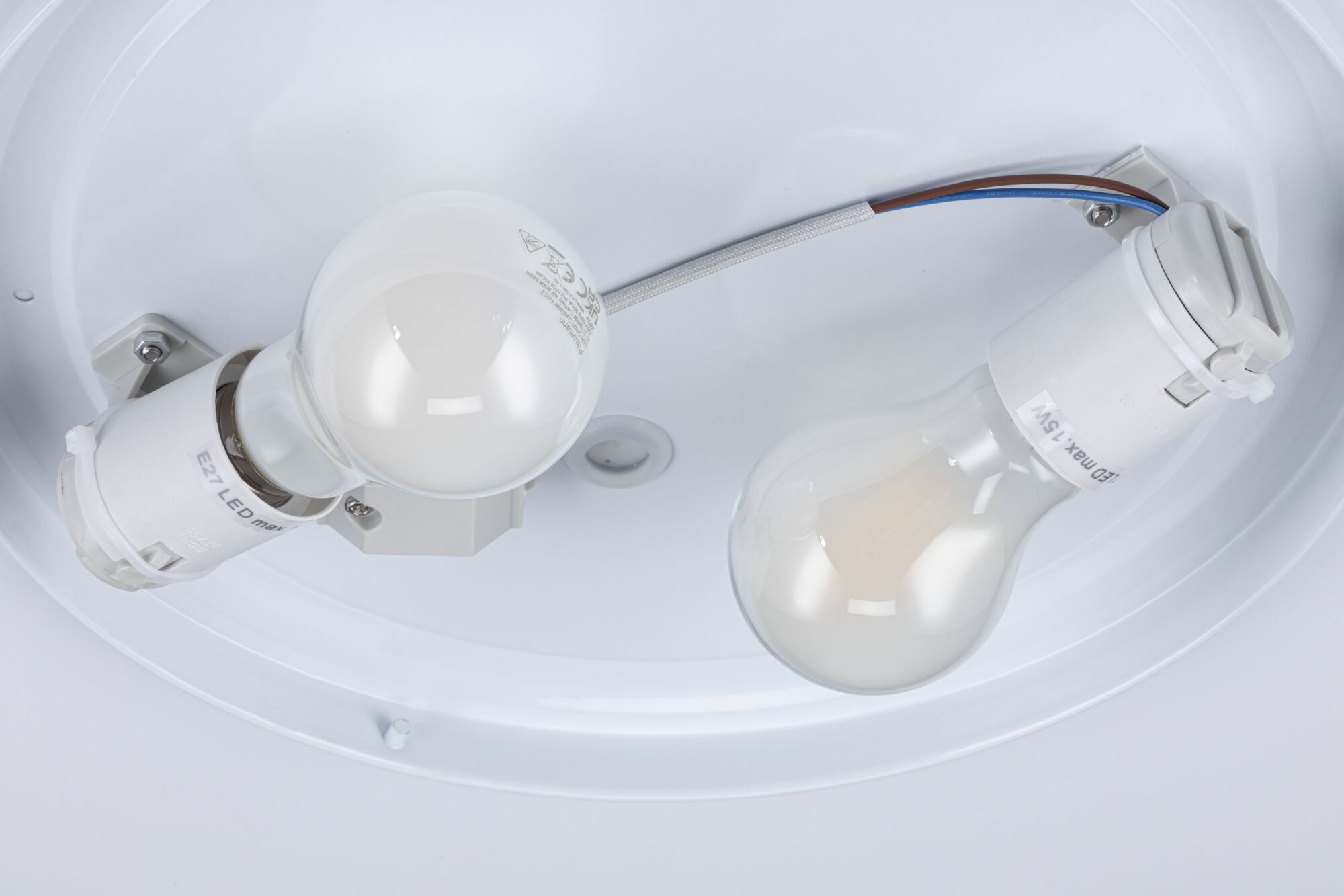 De ronde wand- en plafondlamp Axin in wit, met een diameter van 350mm is universeel inzetbaar en met zijn IP44-spatwaterbescherming met name geschikt voor gebruik in de badkamer of buiten. Door zijn sobere design past hij perfect in de meest uiteenlopende interieurstijlen en zorgt ook in functionele ruimtes, trappenhuizen en gangen voor de juiste verlichting. Dankzij de gesatineerde diffusor wordt het licht gelijkmatig verdeeld. Er kunnen twee lichtbronnen naar wens met E27-sokkel worden gekozen en in de fittingen worden geschroefd. Met de praktische bajonetsluiting is de montage kinderspel - het reinigen of vervangen van het verlichtingsmiddel is daardoor ook heel eenvoudig. Zijn hoge slagvastheid verhoogt ook de betrouwbaarheid bij dagelijks gebruik.