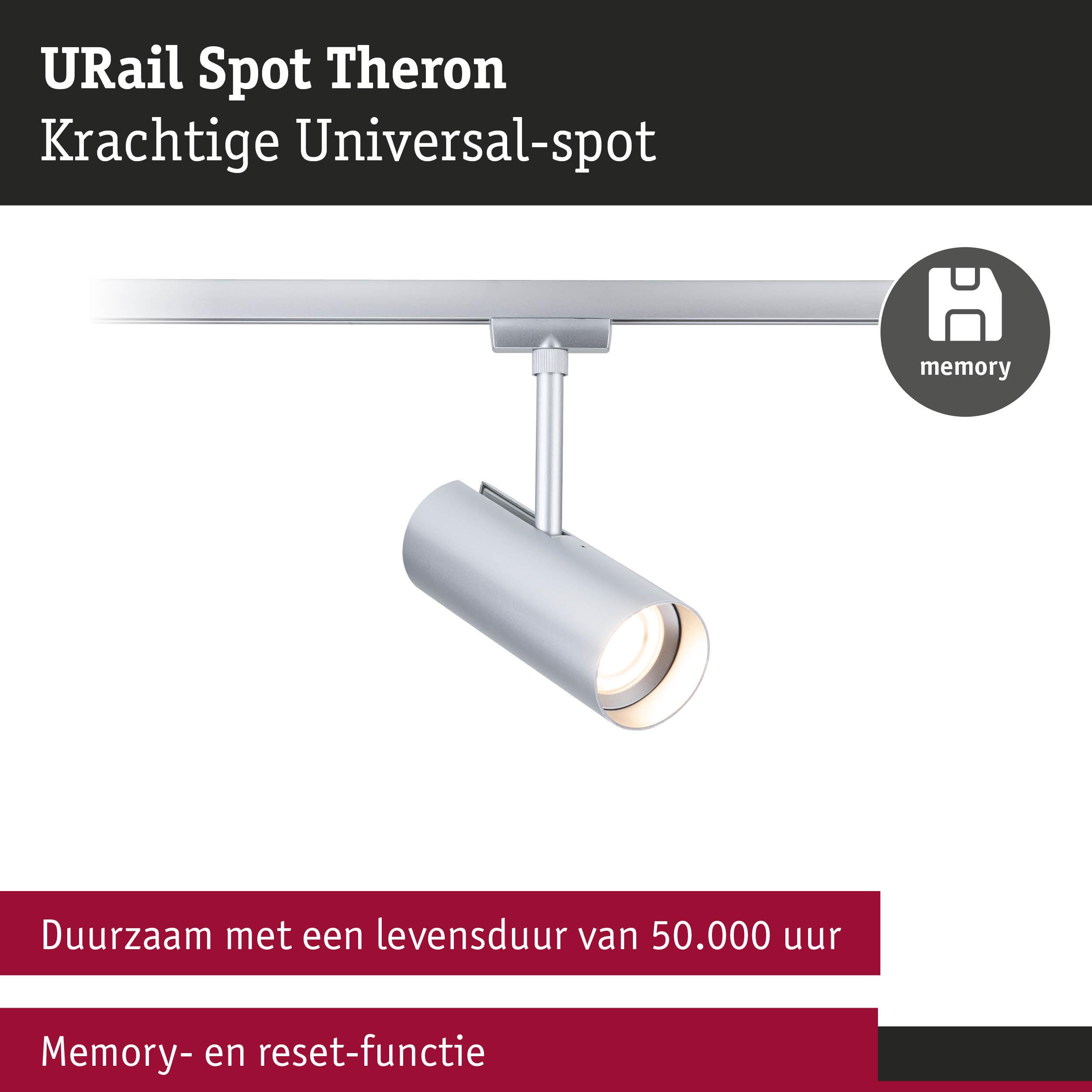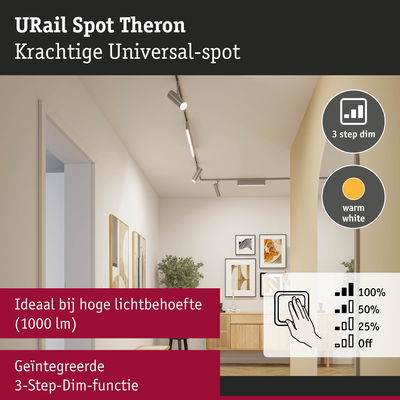 De warmwitte railspot Theron in Chroom mat is bijzonder energie-efficiënt en creëert met een vermogen van ruim 1000 lm een zeer heldere verlichting. De hoge kleurweergave van CRI ≥ 90 zorgt hierbij voor natuurlijke en krachtige kleuren. Het licht kan flexibel worden gericht, doordat de buisvormige spot zwenkbaar is. Via een gewone lichtschakelaar kan de helderheid op 100%, 50% en 25% worden ingesteld - zo kan de individuele lichtenscenering flexibel aan elke situatie worden aangepast. Dankzij de geïntegreerde geheugenfunctie wordt bij opnieuw inschakelen de laatst gekozen dimstand geactiveerd. Met een lange levensduur van 50.000 h zorgt de LED-spot voor een langdurig gebruik. In combinatie met de bijbehorende URail-componenten ontstaat een geheel individueel lichtsysteem met een totaal vermogen tot max. 1000 W.