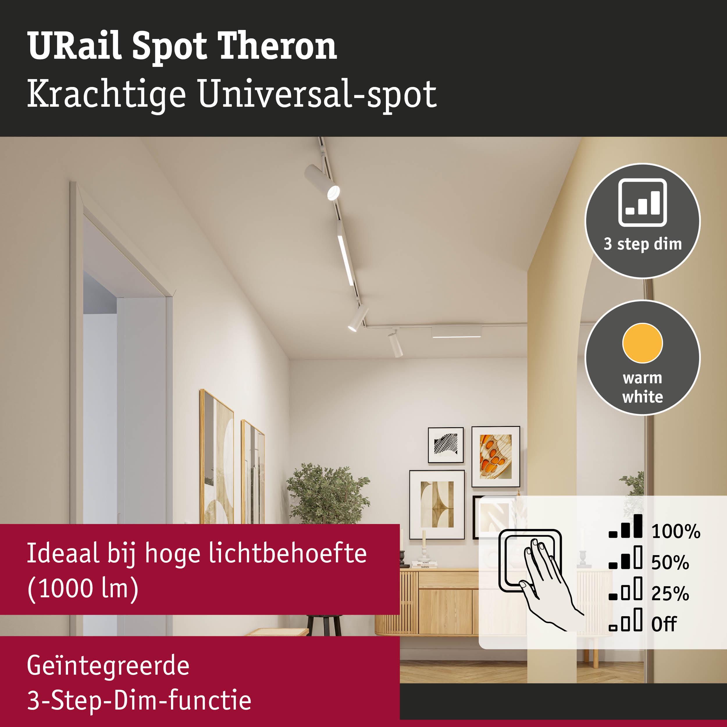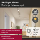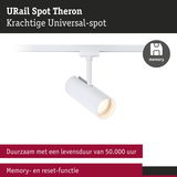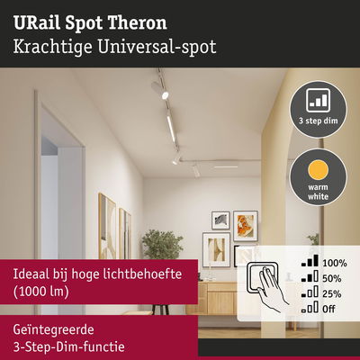 De warmwitte railspot Theron in Signaalwit is bijzonder energie-efficiënt en creëert met een vermogen van ruim 1000 lm een zeer heldere verlichting. De hoge kleurweergave van CRI ≥ 90 zorgt hierbij voor natuurlijke en krachtige kleuren. Het licht kan flexibel worden gericht, doordat de buisvormige spot zwenkbaar is. Via een gewone lichtschakelaar kan de helderheid op 100%, 50% en 25% worden ingesteld - zo kan de individuele lichtenscenering flexibel aan elke situatie worden aangepast. Dankzij de geïntegreerde geheugenfunctie wordt bij opnieuw inschakelen de laatst gekozen dimstand geactiveerd. Met een lange levensduur van 50.000 h zorgt de LED-spot voor een langdurig gebruik. In combinatie met de bijbehorende URail-componenten ontstaat een geheel individueel lichtsysteem met een totaal vermogen tot max. 1000 W.