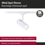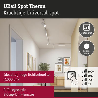 De neutraalwitte URail railspot Theron in Signaalwit is bijzonder energie-efficiënt en creëert met een vermogen van 1000 lm een zeer heldere verlichting. De hoge kleurweergave van CRI ≥ 90 zorgt hierbij voor natuurlijke en krachtige kleuren. Het licht kan flexibel worden gericht, doordat de buisvormige spot zwenkbaar is. Via een gewone lichtschakelaar kan de helderheid op 100%, 50% en 25% worden ingesteld - zo kan de individuele lichtenscenering flexibel aan elke situatie worden aangepast. Dankzij de geïntegreerde geheugenfunctie wordt bij opnieuw inschakelen de laatst gekozen dimstand geactiveerd. Met een lange levensduur van 50.000 h zorgt de LED-spot voor een langdurig gebruik. In combinatie met de bijbehorende URail-componenten ontstaat een geheel individueel lichtsysteem met een totaal vermogen tot max. 1000 W.