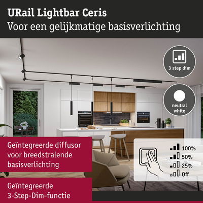 De URail Lightbar Ceris in Zwart mat met een kleurtemperatuur van 4000K creëert een activerende, neutraalwitte lichtsfeer in woonruimtes, werkkamers, gangen of andere ruimtes. De breedstralende diffusor zorgt daarbij voor een niet-verblindende en gelijkmatige lichtverdeling. Door het hoogwaardige aluminium en subtiele design past hij naadloos in individuele woonconcepten. De lengte van 32,2 cm is niet ideaal? Geen probleem - Er kunnen zoveel Lightbars als nodig met elkaar worden verbonden, om voor verschillende ruimtes de perfecte lengte te krijgen. Hiervoor kunnen de eindkappen heel eenvoudig worden afgenomen en met de meegeleverde verbindingen tot de gewenste lengte worden uitgebreid. Verbinden met de Lightbar Ceris zonder diffusor is ook probleemloos mogelijk. Een ander voordeel is de 3-stepdimfunctie waarmee de helderheid in drie standen kan worden ingesteld met een gewone lichtschakelaar. De geïntegreerde geheugenfunctie slaat de laatst gebruikte instelling op tot het volgende inschakelen, voor maximaal comfort. Optioneel kan de gewenste helderheid eenmalig worden ingesteld en de Lightbar als klassieke on/off-armatuur worden gebruikt. Resetten is naar wens mogelijk zonder gecompliceerde uitbouw. Het ingebouwde voorschakelapparaat en de LED-printplaat zijn vervangbaar door Paulmann of door een specialist.