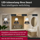 De smart inbouwlampen set Nova Coin in Zwart mat met kleurveranderingsfunctie schept in elke ruimte een individuele woonsfeer. In de leveringsomvang zijn drie vervangbare LED-verlichtingsmiddelen en hoogwaardige aluminium inbouwringen inbegrepen. Dankzij de bijzonder hoge IP-bescherming van IP44 zijn de armaturen perfect geschikt voor vochtige ruimtes en beschermd tegen spatwater. Met een vermogen van 3x6 watt en ZigBee 3.0-besturing zorgen ze voor een efficiënte en innovatieve verlichtingsoplossing. Zigbee 3.0 is een draadloos overdrachtsprotocol dat apparaten van verschillende fabrikanten met elkaar verbindt. Zo kunnen de armaturen via de app, afstandsbediening of spraak afzonderlijk of gezamenlijk worden bestuurd: gezellig warm goudlicht (2200 K), zakelijk helder daglicht wit (6500 K) - met de Tunable White-functie kan de lichtkleur naar wens traploos worden ingesteld. Met de traploze dimfunctie kan de helderheid naar wens worden aangepast, variërend van helder licht om te werken tot sfeervol licht om te ontspannen. De smart inbouwlampen kunnen nog steeds eenvoudig en gemakkelijk via een gangbare lichtschakelaar worden in- en uitgeschakeld. Daarnaast zorgt het geïntegreerde memory-effect ervoor dat altijd de laatst gebruikte lichtinstelling wordt onthouden voor een maximaal comfort. De set wordt erg gemakkelijk en efficiënt gemonteerd dankzij de koppelbare en vervangbare coins, de geringe inbouwdiepte van slechts 45 mm en de 230V-aansluiting.
