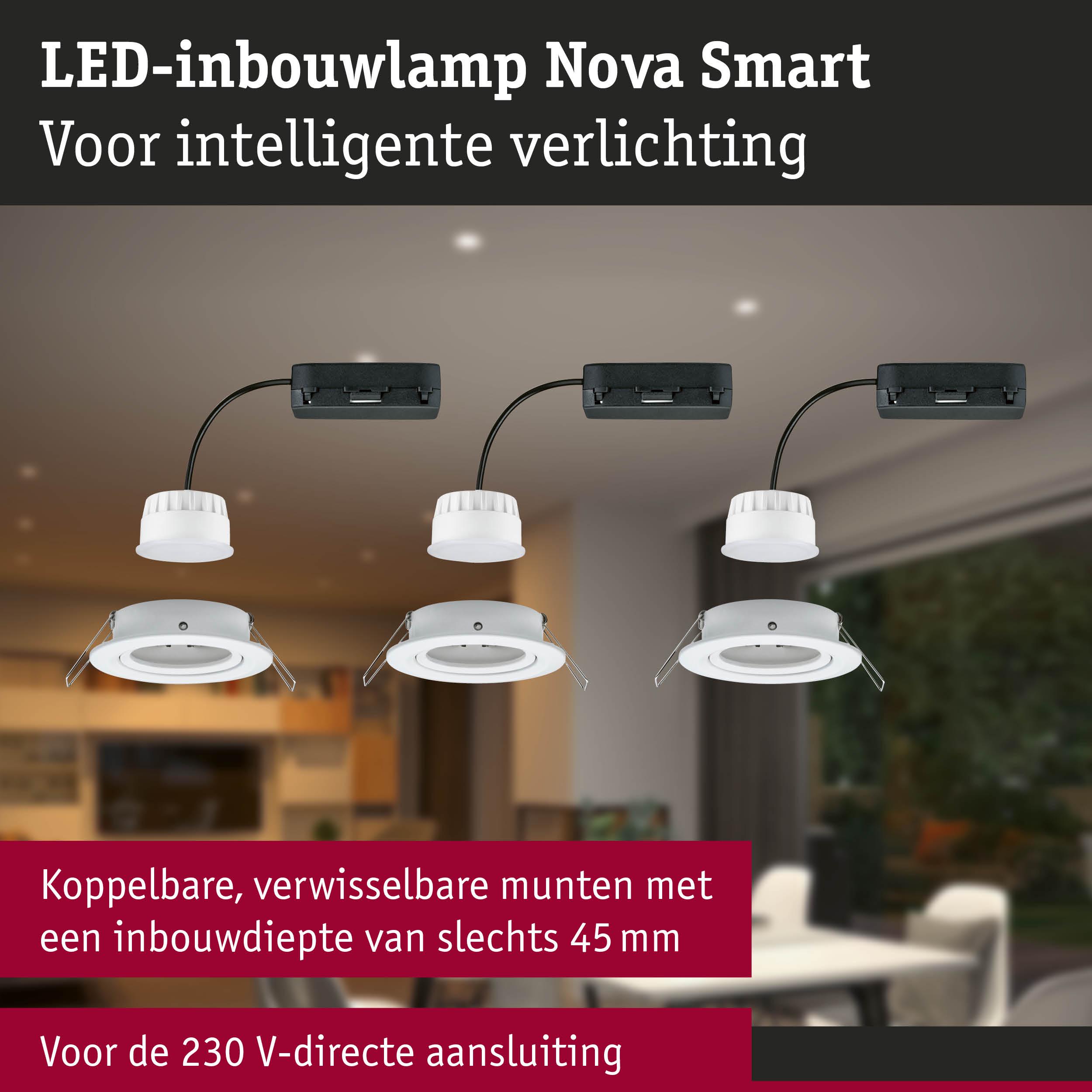16 miljoen kleuren, 16 miljoen lichtsferen – de smart inbouwlampen set Nova Coin in Wit mat met kleurveranderingsfunctie schept in elke ruimte een individuele woonsfeer. In de leveringsomvang is een hoogwaardige aluminium inbouwring en een vervangbaar LED-verlichtingsmiddel met een vermogen van 6 watt en RGBW-Zigbee 3.0-besturing inbegrepen. Zigbee 3.0 is een draadloos overdrachtsprotocol dat apparaten van verschillende fabrikanten met elkaar verbindt. Zo kan het armatuur via de app, afstandsbediening of spraak afzonderlijk of gezamenlijk worden bestuurd: gezellig warm goudlicht (2200 K), zakelijk helder daglicht wit (6500 K) of een stralend kleurverloop - de combinatie van Tunable White, RGB en dimfunctie biedt talloze mogelijkheden. De smart inbouwlamp kan nog steeds eenvoudig en gemakkelijk via een gangbare lichtschakelaar worden in- en uitgeschakeld. Daarnaast zorgt het geïntegreerde memory-effect ervoor dat altijd de laatst gebruikte lichtinstelling wordt onthouden voor een maximaal comfort. Dankzij de zwenkbaarheid van het armatuur kan het licht op elke gewenste plek worden gericht. De set wordt erg gemakkelijk en efficiënt gemonteerd dankzij de koppelbare en vervangbare coins, de geringe inbouwdiepte van slechts 45 mm en de 230V-aansluiting.