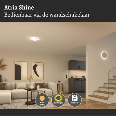 Het veelzijdige paneel Atria Shine met een diameter van 290mm biedt zowel directe als indirecte verlichting door de afzonderlijk bestuurbare front- en backlight-techniek. Kan gemakkelijk worden bestuurd via een wandschakelaar door meerdere keren snel in en uit te schakelen. Hierdoor kan afhankelijk van de stemming of toepassingssituatie tussen volle verlichting, alleen het frontlight of alleen het sfeervolle backlight worden gevarieerd. Dankzij de geheugenfunctie wordt de gekozen lichtscène opgeslagen, zodat de lamp bij de volgende keer inschakelen in de vooraf gekozen lichtintensiteit brandt. Het paneel zorgt voor een gelijkmatige verlichting in binnenruimtes en creëert door de warmwitte lichtkleur van 3000 K een huiselijke sfeer. Het subtiele design van het paneel overtuigt door zijn bijzondere vlakke constructie en dankzij de sfeervolle backlight-technologie lijkt het paneel op een subtiele manier te zweven. Montage aan wand of plafond is dankzij de snelklem en draaivergrendeling heel eenvoudig en ongecompliceerd uitvoerbaar
