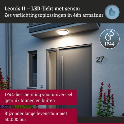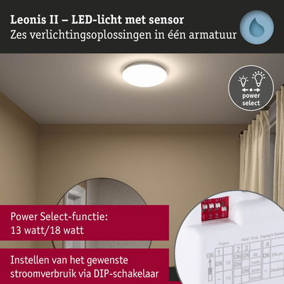 De plafondlamp Leonis is dankzij de White Select functie en de geïntegreerde bewegings- en schemersensor een echte allrounder. Naast veelzijdige verlichtingsmogelijkheden zorgt hij door de automatische lichtbesturing voor een hoge mate aan veiligheid, comfort en energie-efficiëntie. Dankzij de hoge IP44-bescherming is de plafondlamp in Wit bijzonder geschikt voor vochtige ruimtes en kan deze zowel binnen als buiten worden gebruikt. Hij is daarom perfect geschikt voor toepassingen in badkamers, gangen, keukens, commerciële ruimtes of terrassen. Bij gebruik van een DIP-schakelaar kan de kleurtemperatuur naar wens ook na de montage geheel eenvoudig worden ingesteld. Met de innovatieve Power Select functie kan de vermogensopname van het armatuur worden bestuurd. Afhankelijk van het toepassingsgebied kan tussen 13 W en 18 W worden gekozen. De geïntegreerde schemersensor stelt het licht automatisch in op de gewenste helderheid wanneer dat nodig is. Daarnaast schakelt de geïntegreerde HF-bewegingssensor het licht in zodra iemand het armatuur nadert. Vanaf welke afstand en met welke verlichtingsduur kan via de hoogfrequentiesensor worden ingesteld. De verlichtingsduur kan met verschillende tijdintervallen worden ingesteld: kies uit 5 seconden, 1 minuut, 3 minuten of tot 10 minuten. In combinatie met de Power Select functie kan het energieverbruik geoptimaliseerd worden. Hiermee dalen niet alleen de kosten, maar het is ook beter voor het milieu. Op het gebied van duurzaamheid overtuigt de plafondlamp Leonis bovendien met een bijzonder hoge levensduur van 50.000 uur – ideaal voor langdurig en grondstofbesparend gebruik!