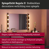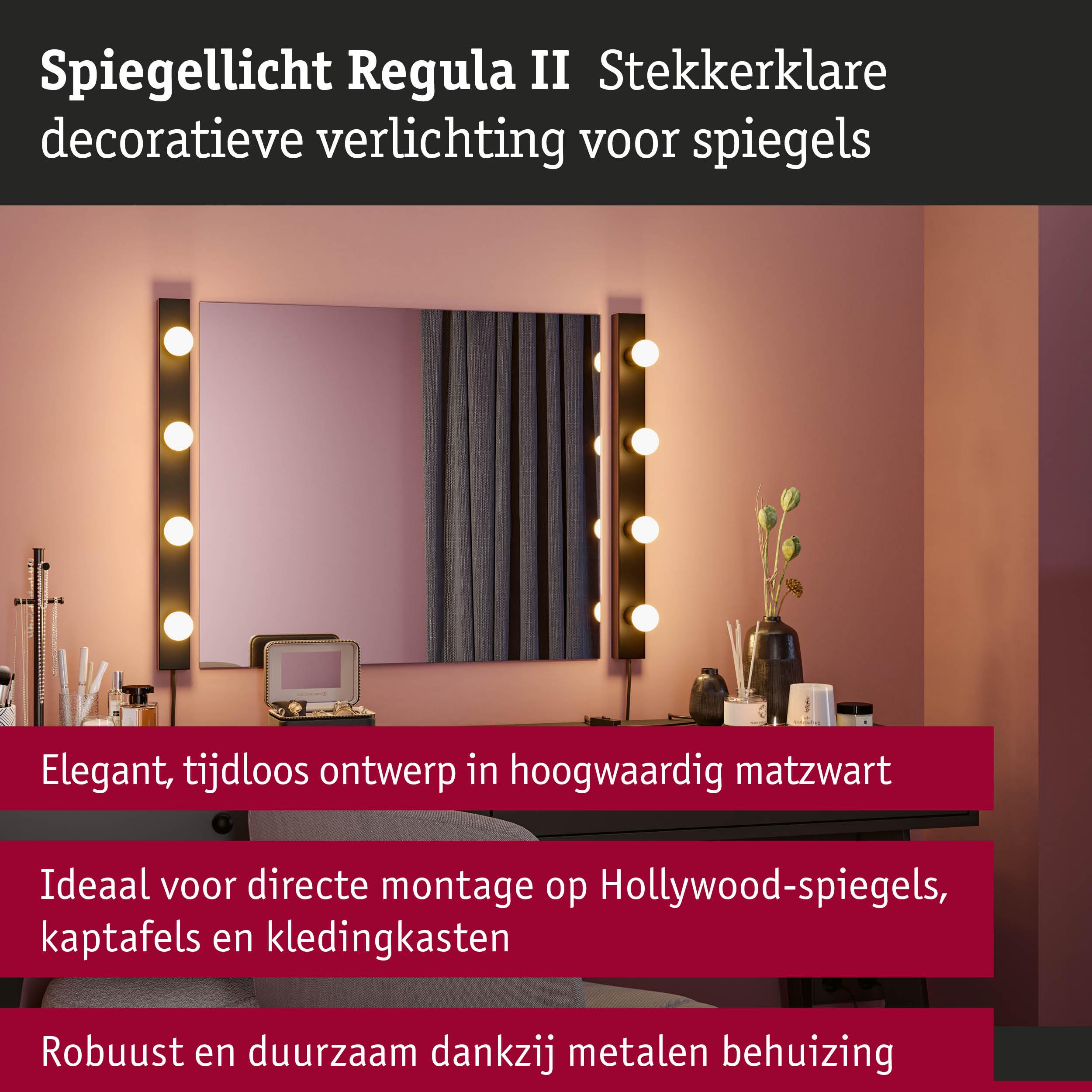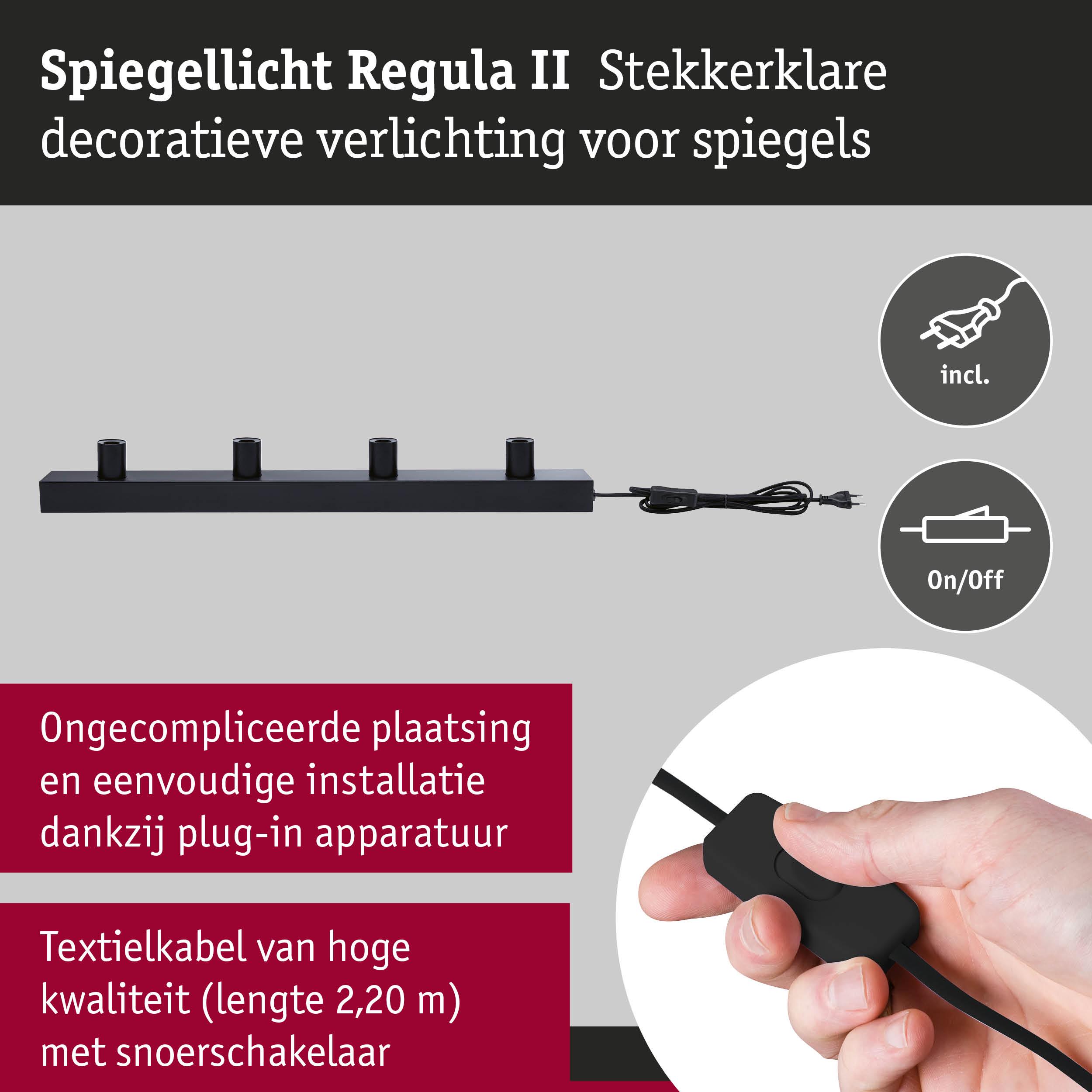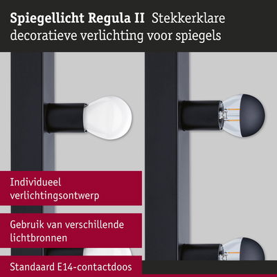 De 4-vlammige Regula II is de ideale keuze voor een decoratieve spiegelverlichting. Hij wordt met een praktische textiel kabelschakelaar in de kleur Zwart geleverd, zodat de montage kinderlijk eenvoudig is. Je hebt alleen een contactdoos nodig, een stroomaansluitpunt is niet meer vereist. Met zijn moderne en strakke design in Zwart past hij perfect in verschillende interieurstijlen en is zowel bij de make-uptafel als ook op de gang een echte blikvanger. Met een lengte van 60 cm is hij afgestemd op standaardafmetingen van spiegels. Door het gebruik van verschillende lichtbronnen met E14-fitting kan hij aan de eigen toepassing worden aangepast. Verspiegelde lampen zijn in het bijzonder geschikt voor een betoverende make-up spiegel in Hollywood-stijl. Ze zorgen voor een niet-verblindende verlichting en creëren aantrekkelijke lichtreflecties. Een modern-klassieke look daarentegen ontstaat door het gebruik van een opaal verlichtingsmiddel, dat rondom een stralend licht afgeeft. De installatie van de Regula II is zeer eenvoudig: hij kan boven of naast de spiegel aan de wand worden gemonteerd. Na het indraaien van het gewenste verlichtingsmiddel is hij direct klaar voor gebruik. Een zachte doek is het beste geschikt om de armaturen schoon te maken – gebruik geen microvezeldoek.