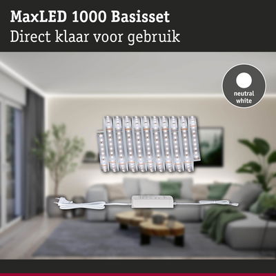 De neutraalwitte MaxLED 1000 basisset is de ideale keuze voor een moderne en zeer energie-efficiënte verlichtingsoplossing. Vergeleken met conventionele lampen verbruikt de LED strip 40% minder energie bij dezelfde lichtoutput. De strip is uitstekend geschikt voor de toepassing in profielen en is met 8 W en 1100lm/m zo krachtig dat hij probleemloos kan worden gebruikt om de hele ruimte te verlichten. De kleurtemperatuur van 4000K zorgt voor een gezellig en niet-verblindend licht - ideaal voor de verlichting van woonkamers, keukens of slaapkamers. Om op elk gewenst moment de gewenste lichtsfeer te creëren, kan de helderheid flexibel worden gedimd. De strip kan heel eenvoudig worden ingekort met een schaar, waardoor hij heel gemakkelijk aan de ruimtelijke omstandigheden kan worden aangepast. De strip kan probleemloos op meubels, kasten of wanden worden aangebracht, wat veelzijdige ontwerpmogelijkheden biedt. De basisset bevat behalve de stripe een passend voorschakelapparaat. Hij kan naar wens worden uitgebreid met een besturingseenheid met afstandsbediening.