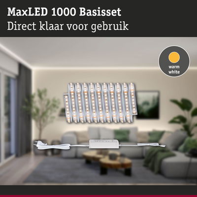 De warmwitte MaxLED 1000 basisset is de ideale keuze voor een moderne en zeer energie-efficiënte verlichtingsoplossing. Vergeleken met conventionele lampen verbruikt de LED strip 40% minder energie bij dezelfde lichtoutput. De strip is uitstekend geschikt voor de toepassing in profielen en is met 22 W en 1100lm/m zo krachtig dat hij probleemloos kan worden gebruikt om de hele ruimte te verlichten. De kleurtemperatuur van 2700K zorgt voor een gezellig en niet-verblindend licht - ideaal voor de verlichting van woonkamers, keukens of slaapkamers. Om op elk gewenst moment de gewenste lichtsfeer te creëren, kan de helderheid flexibel worden gedimd. De strip kan heel eenvoudig worden ingekort met een schaar, waardoor hij heel gemakkelijk aan de ruimtelijke omstandigheden kan worden aangepast. De strip kan probleemloos op meubels, kasten of wanden worden aangebracht, wat veelzijdige ontwerpmogelijkheden biedt. De basisset bevat behalve de stripe een passend voorschakelapparaat. Hij kan naar wens worden uitgebreid met een besturingseenheid met afstandsbediening.