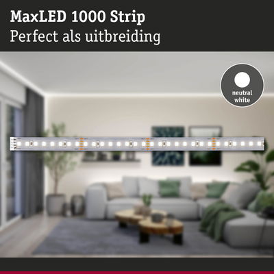 De warmwitte MaxLED 1000 LED strip is de ideale keuze voor een moderne en zeer energie-efficiënte verlichtingsoplossing. Vergeleken met conventionele lampen verbruikt de LED strip 40% minder energie bij dezelfde lichtoutput. De strip is uitstekend geschikt voor de toepassing in profielen en is met 8 W en 1100lm/m zo krachtig dat hij probleemloos kan worden gebruikt om de hele ruimte te verlichten. De kleurtemperatuur van 4000K zorgt voor een gezellig en niet-verblindend licht - ideaal voor de verlichting van woonkamers, keukens of slaapkamers. Om op elk gewenst moment de gewenste lichtsfeer te creëren, kan de helderheid flexibel worden gedimd. De strip kan heel eenvoudig worden ingekort met een schaar, waardoor hij heel gemakkelijk aan de ruimtelijke omstandigheden kan worden aangepast. De strip kan probleemloos op meubels, kasten of wanden worden aangebracht, wat veelzijdige ontwerpmogelijkheden biedt.