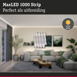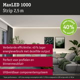 De warmwitte MaxLED 1000 LED strip is de ideale keuze voor een moderne en zeer energie-efficiënte verlichtingsoplossing. Vergeleken met conventionele lampen verbruikt de LED strip 40% minder energie bij dezelfde lichtoutput. De strip is uitstekend geschikt voor de toepassing in profielen en is met 18 W en 1100lm/m zo krachtig dat hij probleemloos kan worden gebruikt om de hele ruimte te verlichten. De kleurtemperatuur van 2700K zorgt voor een gezellig en niet-verblindend licht - ideaal voor de verlichting van woonkamers, keukens of slaapkamers. Om op elk gewenst moment de gewenste lichtsfeer te creëren, kan de helderheid flexibel worden gedimd. De strip kan heel eenvoudig worden ingekort met een schaar, waardoor hij heel gemakkelijk aan de ruimtelijke omstandigheden kan worden aangepast. De strip kan probleemloos op meubels, kasten of wanden worden aangebracht, wat veelzijdige ontwerpmogelijkheden biedt.