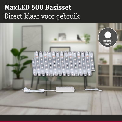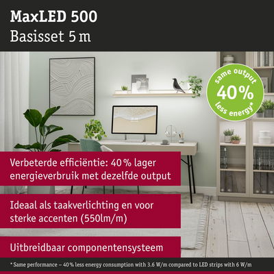 De neutraalwitte MaxLED 500 basisset is de ideale keuze voor een moderne en zeer energie-efficiënte verlichtingsoplossing. Vergeleken met conventionele lampen verbruikt de LED strip 40% minder energie bij dezelfde lichtoutput. De strip is uitstekend geschikt voor de toepassing in profielen en zorgt met een kleurtemperatuur van 4000K voor een gezellig en niet-verblindend werklicht. Om op elk gewenst moment de gewenste lichtsfeer te creëren, kan de helderheid flexibel worden gedimd. De strip kan heel eenvoudig worden ingekort met een schaar, waardoor hij heel gemakkelijk aan de ruimtelijke omstandigheden kan worden aangepast. De strip kan probleemloos op meubels, kasten of wanden worden aangebracht, wat veelzijdige ontwerpmogelijkheden biedt. De basisset bevat behalve de stripe een passend voorschakelapparaat. Hij kan naar wens worden uitgebreid met een besturingseenheid met afstandsbediening.