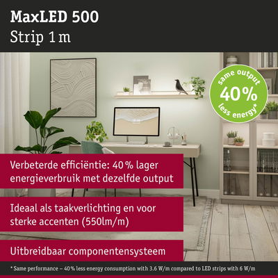 De warmwitte MaxLED 500 LED strip is de ideale keuze voor een moderne en zeer energie-efficiënte verlichtingsoplossing. Vergeleken met conventionele lampen verbruikt de LED strip 40% minder energie bij dezelfde lichtoutput. De strip is uitstekend geschikt voor de toepassing in profielen en zorgt met een kleurtemperatuur van 2700K voor een gezellig en niet-verblindend werklicht. Om op elk gewenst moment de gewenste lichtsfeer te creëren, kan de helderheid flexibel worden gedimd. De strip kan heel eenvoudig worden ingekort met een schaar, waardoor hij heel gemakkelijk aan de ruimtelijke omstandigheden kan worden aangepast. De strip kan probleemloos op meubels, kasten of wanden worden aangebracht, wat veelzijdige ontwerpmogelijkheden biedt.