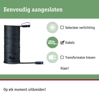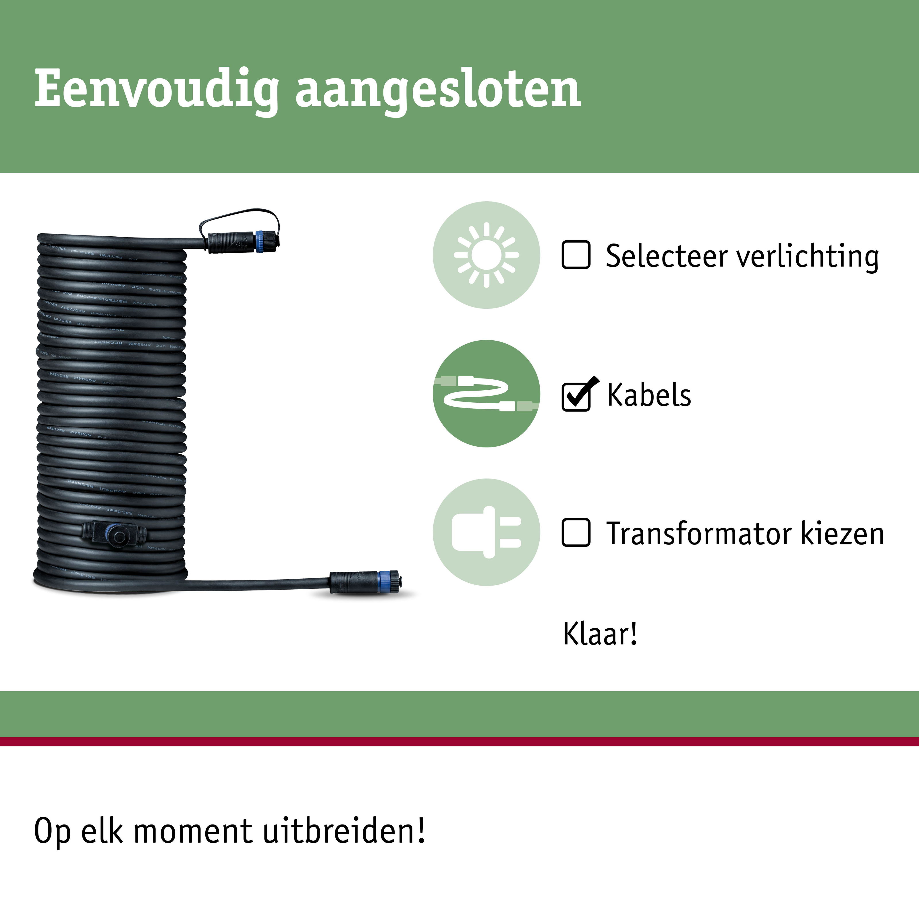 De Plug & Shine-verbindingskabel overbrugt afstanden tot tien meter en maakt de aansluiting van twee aanvullende armaturen of extra toebehoren mogelijk. Niet-benodigde uitgangen worden met de bijgeleverde afdekkappen afgesloten, om de IP68-classificatie (dompeldicht) te garanderen. In combinatie met armaturen en trafo’s uit de Plug & Shine-serie verlicht u uw buitenruimte geheel naar wens: van de huismuur via het terras tot en met de tuinpaden en planten.