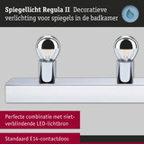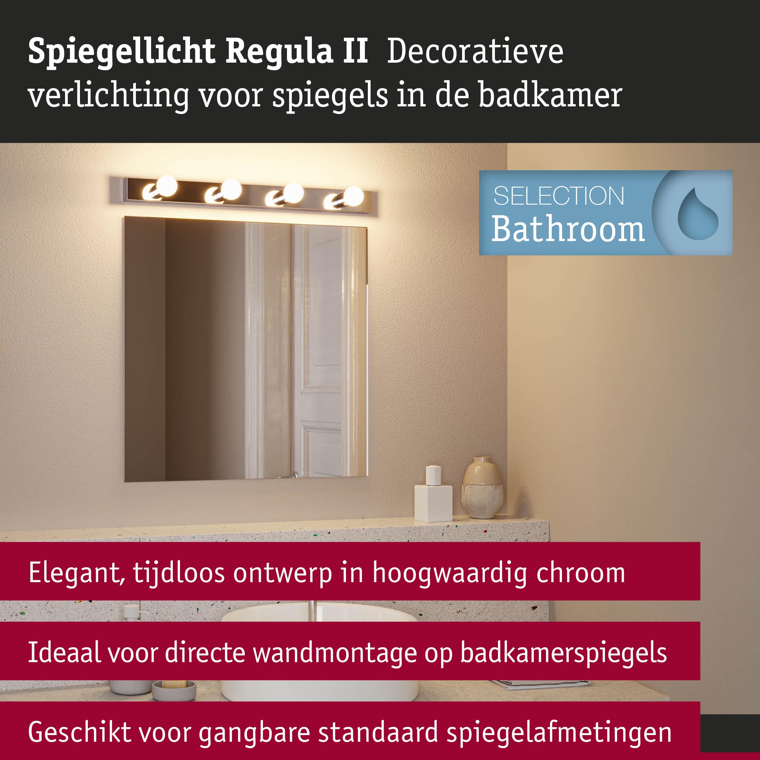 Stralend mooi – de ideale verlichtingsoplossingen voor de badkamer. Deze praktische set bevat de Regula II lichtstrip in Chroom, Kopspiegel zilver inclusief geschikte kopspiegellampen. Door zijn bijzonder hoge IP-bescherming van IP44 is de 4-vlammige Regula II lichtstrip beschermd tegen spatwater en is dus ideaal voor gebruik in de badkamer of andere vochtige ruimtes. Met zijn moderne en strakke design in is hij universeel inzetbaar in verschillende interieurstijlen. De lengte van 45 cm is aangepast aan de standaardafmetingen van spiegels en is ook bijzonder geschikt voor kleinere spiegels die vaak in het gastentoilet worden toegepast. In de leveringsomvang zijn 4 kopspiegel kogellampen inbegrepen in Chroom, Kopspiegel zilver die de make-upspiegel een glamoureuze Hollywood-look geven. Met een vermogen van 4x4,8W verspreiden ze warmwit licht in alle richtingen. De helderheid kan naar behoefte individueel worden gedimd. De installatie van de Regula II is zeer eenvoudig: hij kan boven of naast de spiegel aan de wand worden gemonteerd. Na het indraaien van de kopspiegel kogellampen of andere gewenste lichtbronnen met een E14 fitting, is deze meteen klaar voor gebruik. Zo staat er niks meer in de weg voor een aangename lichtsfeer in de badkamer. Een zachte doek is het beste geschikt om de armaturen schoon te maken – gebruik geen microvezeldoek. De lamp is dimbaar. De dimbaarheid is afhankelijk van het gebruikte verlichtingsmiddel.