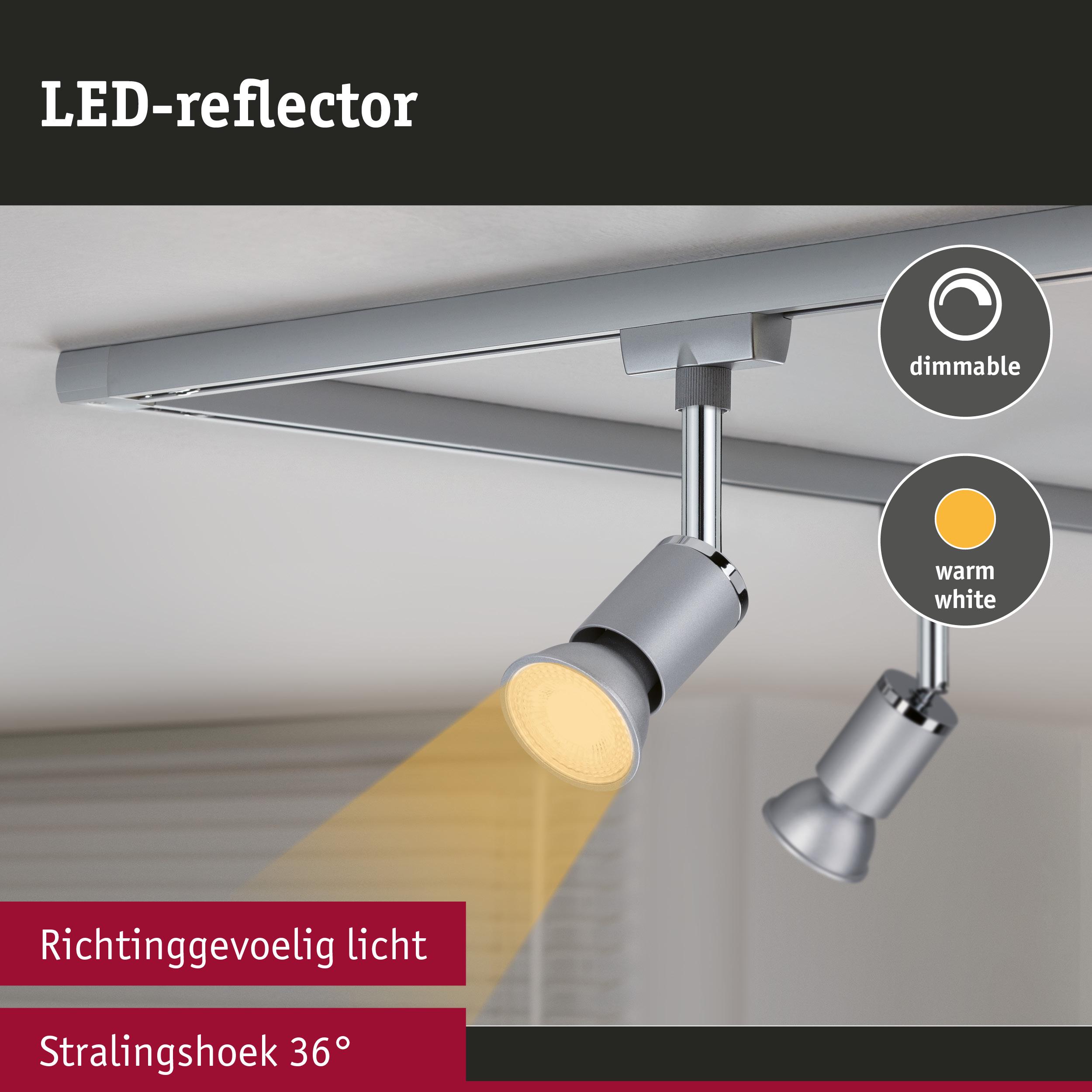 De drie dimbare GU10-reflectoren in chroom mat komen overeen met de RAL-materiaalkleuren van het URail-systeem. De reflectoren creëren gericht licht met een aangename warmwitte lichtkleur. De efficiënte LED-techniek zorgt voor een energiebesparende verlichting. Dankzij de dimbaarheid kan de verlichting naar wens worden aangepast.