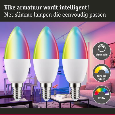 Het kaarsvormige verlichtingsmiddel (set van 3) met RGBW+ en een vermogen van 3x5W en 3x470lm creëert een aangenaam gelijkmatig licht. De lamp past in elke standaard E14 fitting. De verlichtingsmiddel is compatibel met Zigbee 3.0. Zigbee 3.0 is een draadloos overdrachtsprotocol dat apparaten van verschillende fabrikanten met elkaar verbindt. Afhankelijk van uw stemming kunt u kiezen uit echt warmwit, gekleurd licht en verschillende effecten. De Paulmann LED-lampen met Eye Friendly label bieden oogvriendelijk en comfortabel licht. Bij het werken, lezen of ontspannen zorgen de lampen voor het beste zichtcomfort.