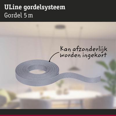De ULine riem dient als basis voor het ULine riem-systeem. Hij is verkrijgbaar in twee lengtes (5 m en 10 m) en vijf kleuren - van klassiek zwart tot ongewoon oranje - en kan overal in de kamer worden geplaatst en indien nodig met een schaar worden ingekort. Bijpassende armaturen kunnen naar wens op de riem worden geplaatst. De 2,1 cm brede riem wordt met behulp van geschikte beugels aan de wand, het plafond of de vloer bevestigd. Zo kan in slechts een paar stappen een persoonlijk verlichtingsconcept worden geïmplementeerd. Het scheurbestendige en duurzame Textiel/Koper van de riem zorgt voor een lange levensduur en een hoge belastbaarheid. De banden zijn gecoat en gemakkelijk schoon te maken. Een speciaal hoogtepunt is de interne, onzichtbare kabelgeleiding, die zorgt voor een strakke look zonder zichtbare draden. Alles uit de riemen wordt geleverd met twee eindkappen van silicon voor een esthetische afwerking. Het ULine riem-systeem is een innovatieve oplossing voor unieke verlichtingservaringen in alle ruimtedimensies en maakt gerichte lichteffecten op wanden, plafonds en vloeren mogelijk.
