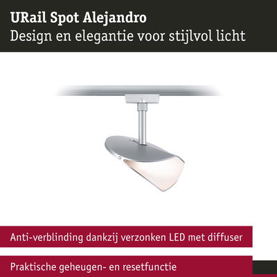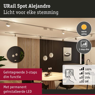 De URail spot Alejandro in Chroom mat is een blikvanger aan de wand of het plafond en geeft met het stijlvolle design de ruimte een extra accent. Met de 3-Step-Dim functie kan het licht eenvoudig worden geregeld via de bestaande wandschakelaar zonder dat er een extra wanddimmer nodig is. Met de dimniveaus van 100%, 50% en 25% biedt de spot een flexibele lichtbesturing, die voor elke stemming en situatie geschikt is. De 3000 kelvin zorgen voor een aangenaam warmwit licht, dat de ruimte optimaal verlicht. Door de verzonken LED-chips met diffusor wordt het licht niet verblindend en gelijkmatig verdeeld, hetgeen voor een aangename sfeer zorgt. Bijzonder praktisch is de memory- en resetfunctie, die het mogelijk maakt om de laatste helderheidsinstelling te behouden of opnieuw in te stellen indien dat nodig is. Het design van de spot voegt een zekere elegantie toe aan elke ruimte en plaatst stijlvolle accenten.