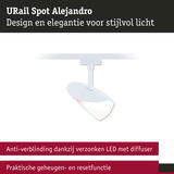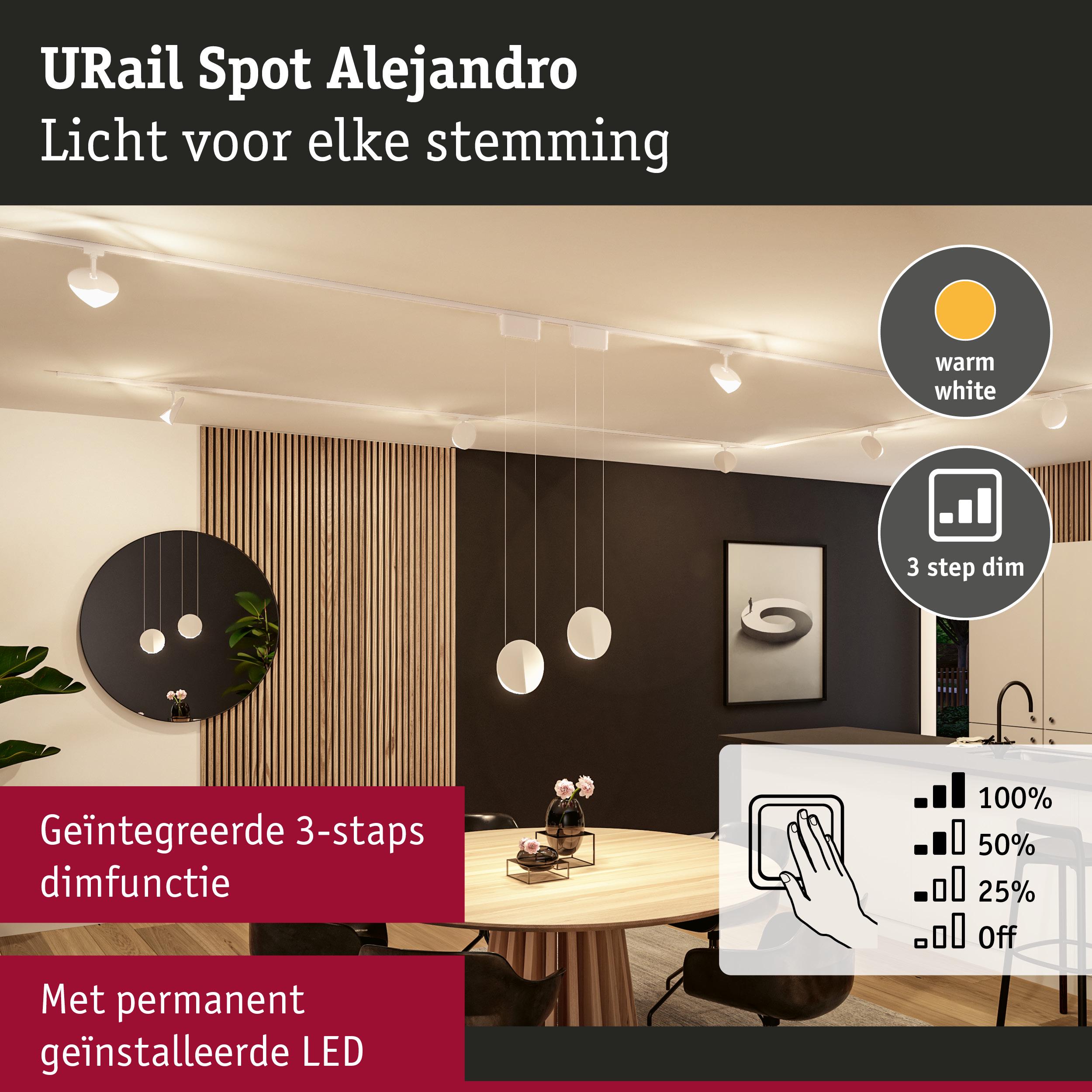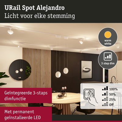 De URail spot Alejandro in Signaalwit is een blikvanger aan de wand of het plafond en geeft met het stijlvolle design de ruimte een extra accent. Met de 3-Step-Dim functie kan het licht eenvoudig worden geregeld via de bestaande wandschakelaar zonder dat er een extra wanddimmer nodig is. Met de dimniveaus van 100%, 50% en 25% biedt de spot een flexibele lichtbesturing, die voor elke stemming en situatie geschikt is. De 3000 kelvin zorgen voor een aangenaam warmwit licht, dat de ruimte optimaal verlicht. Door de verzonken LED-chips met diffusor wordt het licht niet verblindend en gelijkmatig verdeeld, hetgeen voor een aangename sfeer zorgt. Bijzonder praktisch is de memory- en resetfunctie, die het mogelijk maakt om de laatste helderheidsinstelling te behouden of opnieuw in te stellen indien dat nodig is. Het design van de spot voegt een zekere elegantie toe aan elke ruimte en plaatst stijlvolle accenten.