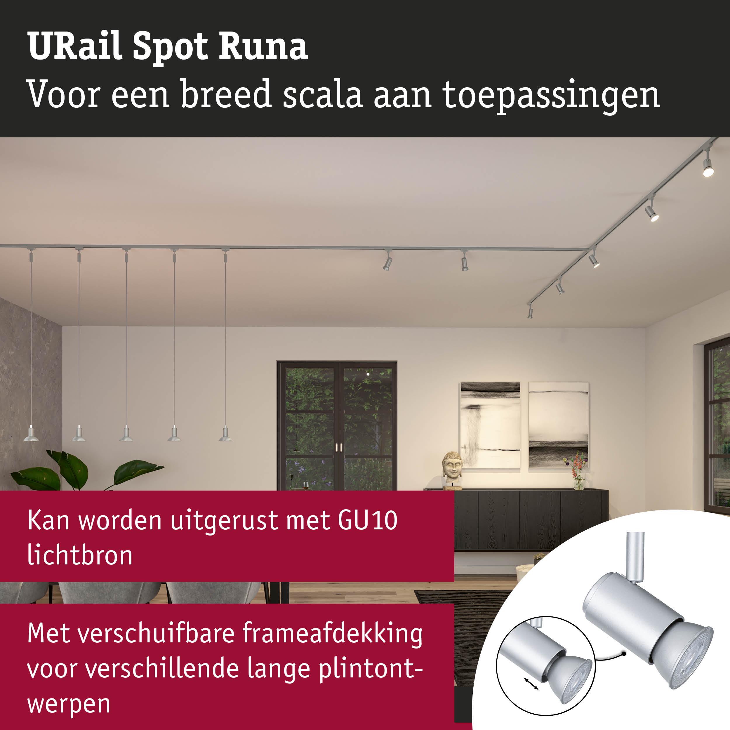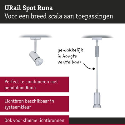 De moderne URail spot Runa in Chroom mat valt op door zijn strakke design. Deze spot heeft een GU10-fitting, waardoor het mogelijk is de lichtbron vrij te kiezen. Met een slimme lichtbron kan de spot comfortabel per app bestuurd worden. De URail Spot Runa is bovendien ideaal te combineren met de hanglamp Runa. De afdekking van de fitting van de spot kan worden verschoven, zodat verlichtingsmiddelen met fittingen van verschillende lengtes zonder problemen gebruikt kunnen worden.